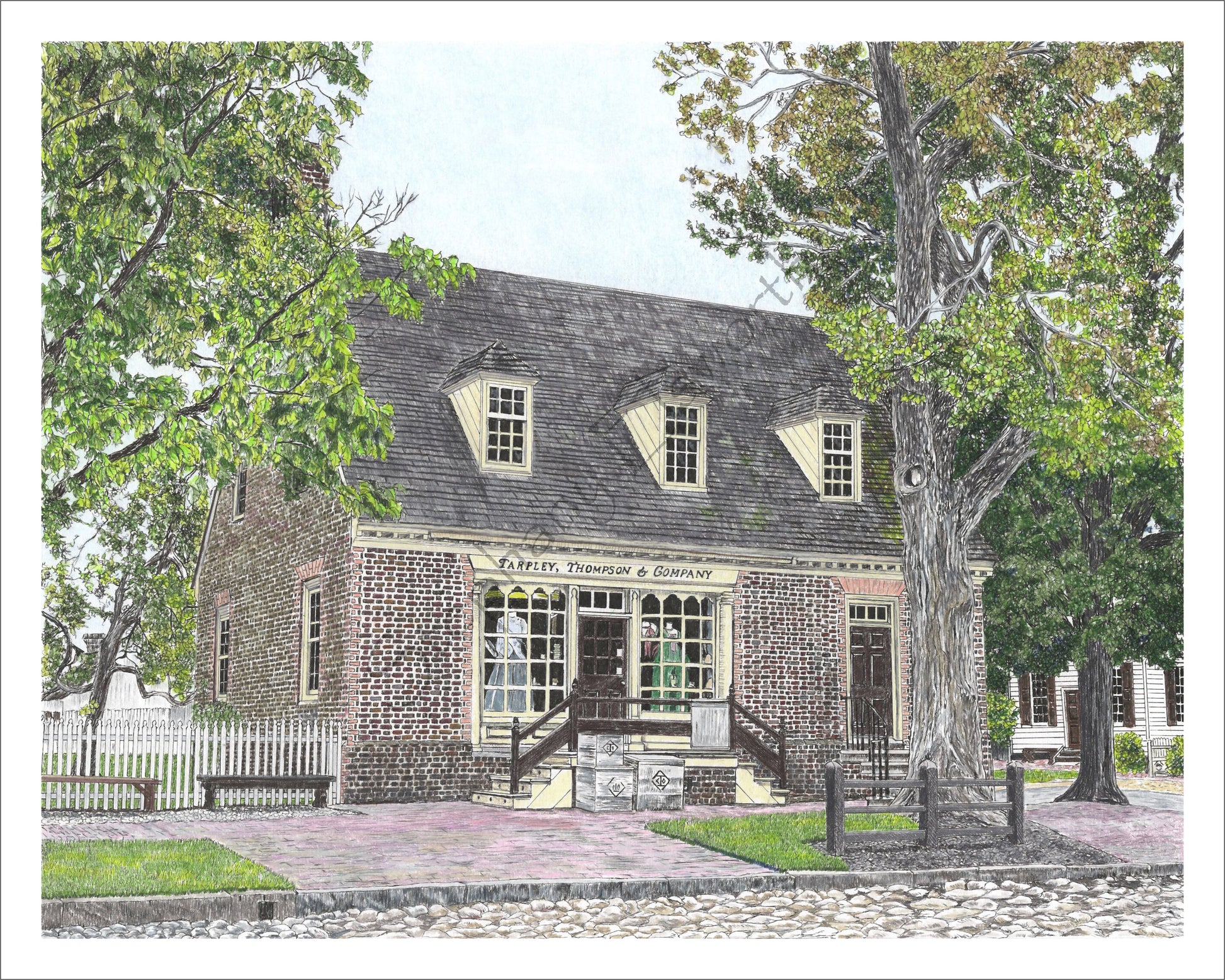 Own a piece of Colonial Williamsburg history with this stunning original pen and ink drawing enhanced with colored pencil. This sought-after artwork depicts the iconic Tarpley, Thompson & Company Shop, a beloved historic landmark. Prints of this very piece are officially sold at Colonial Williamsburg, making this original exceptionally rare and desirable for collectors. Beautifully presented in a 20 x 16 inch black mat, the 14 x 11 inch artwork brings authentic colonial charm to any space. Enjoy free shipping throughout the continental United States.