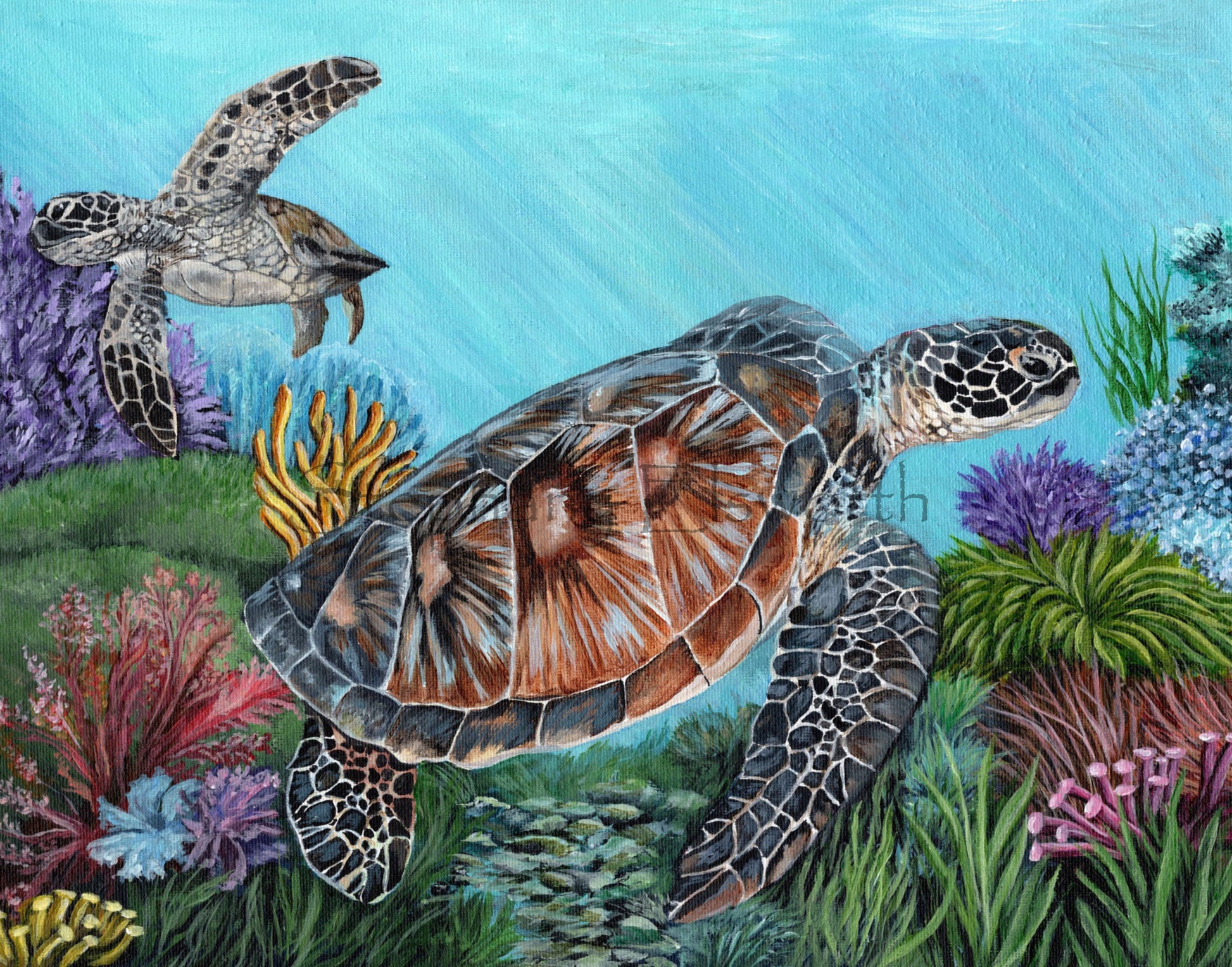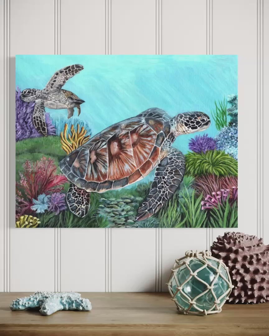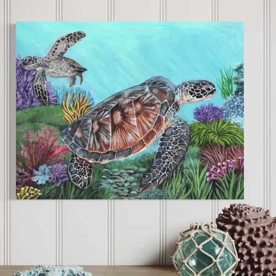 Experience the vibrant beauty of marine wildlife with this 14 x 11 inch original acrylic painting of sea turtles. Realistically detailed and richly colorful, this artwork brings nature’s charm to your home or office. Painted on all four sides with a wire hanger pre-installed, it’s ready to display right out of the box—framing is optional. Enjoy free shipping within the continental United States. Please note, the watermark shown is for viewing only and is not part of the finished piece.