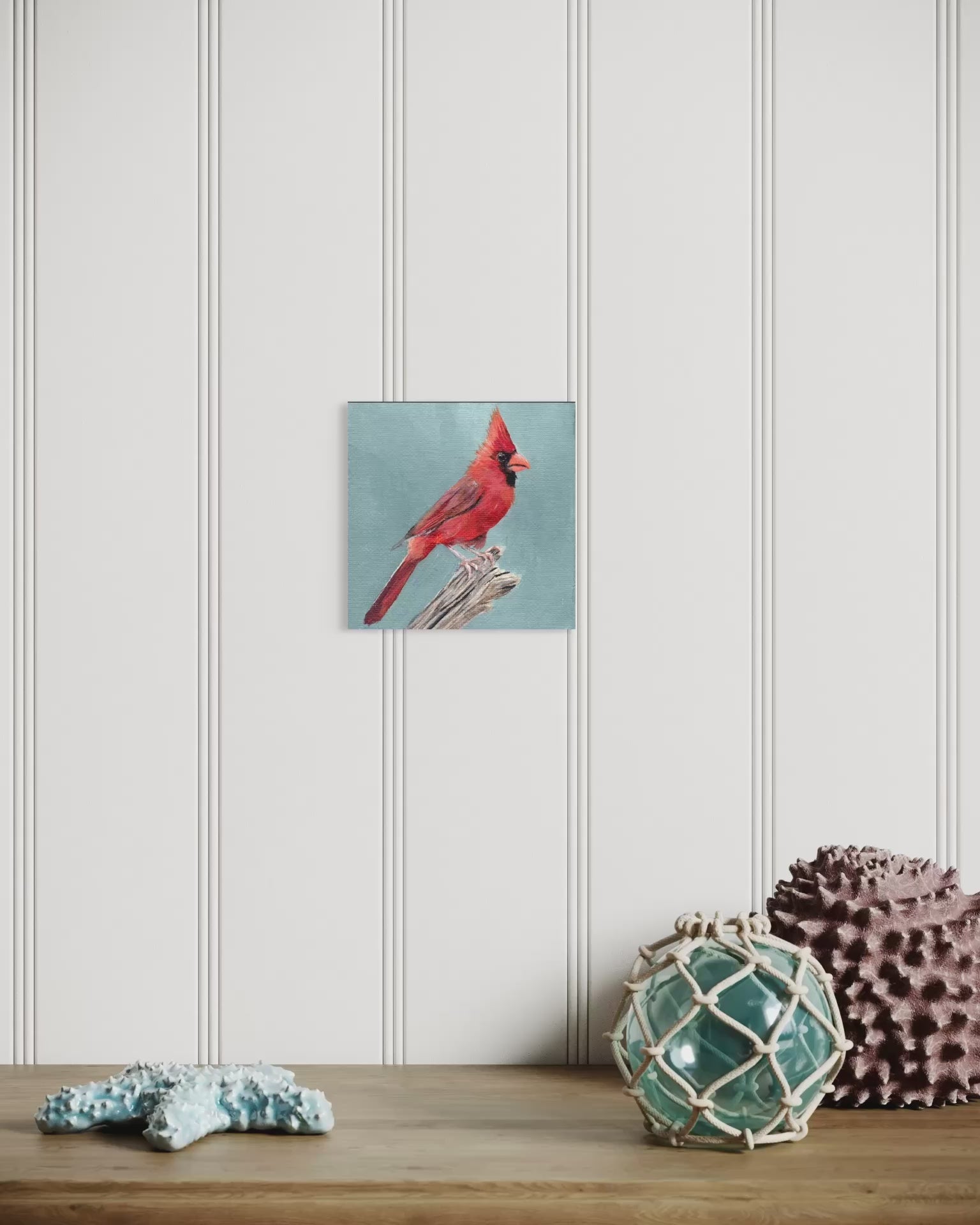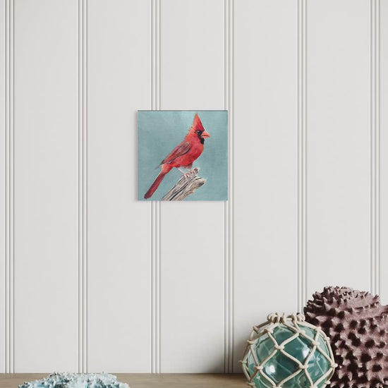 A charming 4 x 4 inch original acrylic painting featuring a cardinal perched against a serene muted blue background. This intimate miniature artwork is painted on canvas board, perfect for displaying on shelves, desks, or gallery walls. The piece arrives unmatted and unframed, allowing you to customize the presentation to match your décor. Ideal for collectors seeking smaller-scale fine art or as a thoughtful gift. Free shipping included within the continental United States. The watermark is for viewing purposes only and is not part of the artwork.