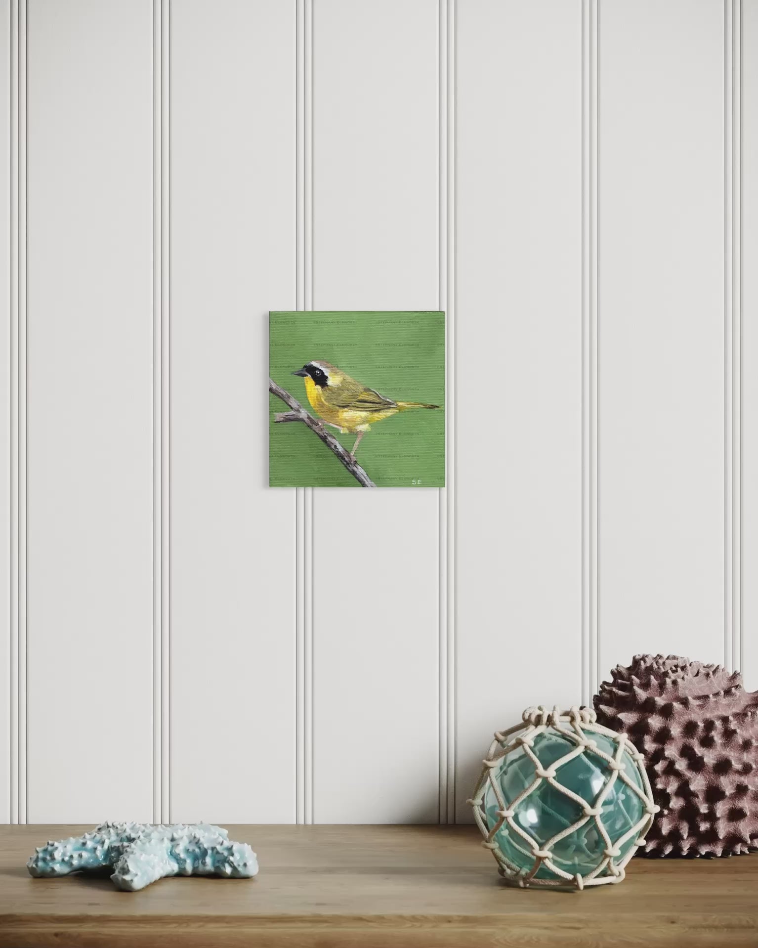 This charming 4 x 4 inch original acrylic painting captures the distinctive beauty of a male common yellowthroat warbler in vibrant detail. Hand-painted on canvas board, this miniature artwork showcases the bird's characteristic black mask and golden-yellow throat with remarkable precision. Ideal for ornithology enthusiasts, birdwatchers, and collectors seeking intimate wildlife art, this piece brings natural elegance to any space. A perfect gift or personal treasure for those who appreciate songbirds and fine craftsmanship. Free shipping in the continental United States only. Note: The frame and watermark are for viewing purposes only. This piece arrives unmatted and unframed.