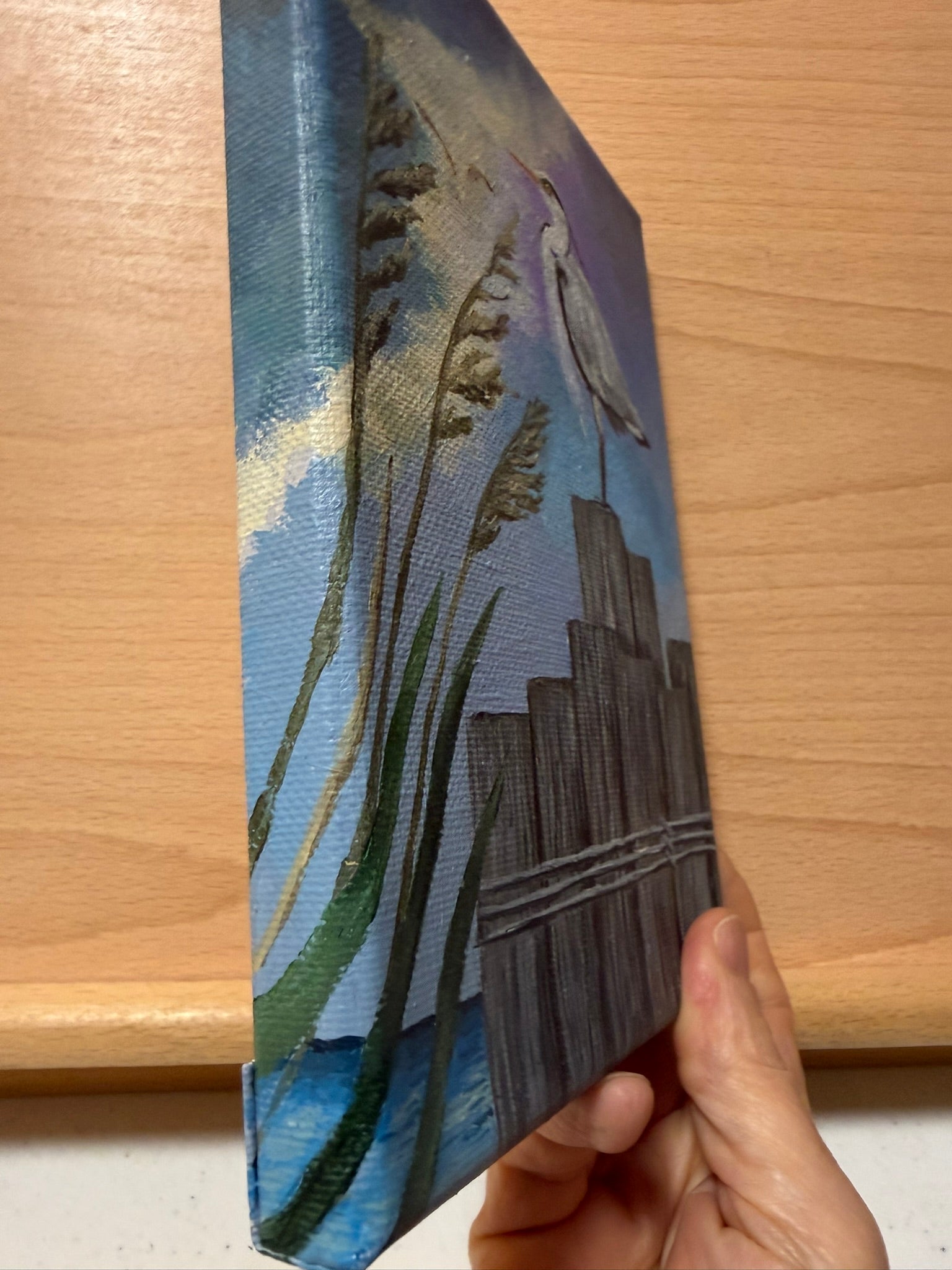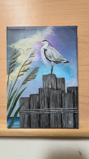 Capture the serene beauty of nature with this original 5 x 7 inch acrylic painting of a gray heron perched on weathered pylons. Painted on stretched canvas, this artwork brings a peaceful coastal scene into your home, evoking the calm of ocean surroundings. Perfect for nature lovers, it adds a touch of tranquility and elegance to any space. Enjoy free shipping within the continental United States and own a unique piece that celebrates the grace of wildlife and the soothing rhythm of the sea.