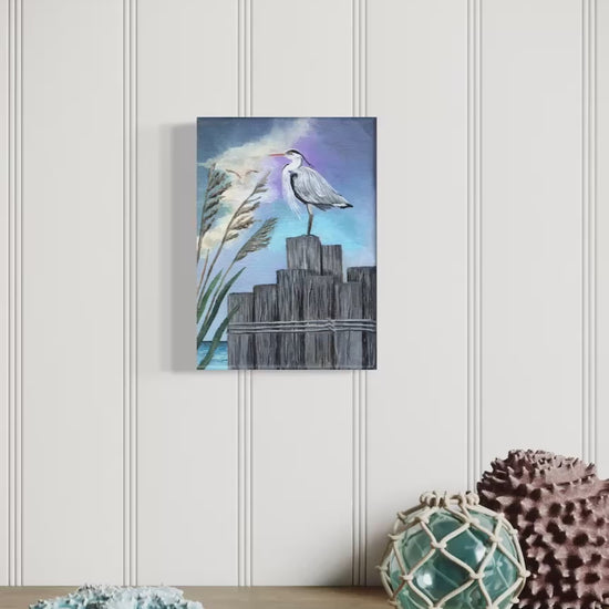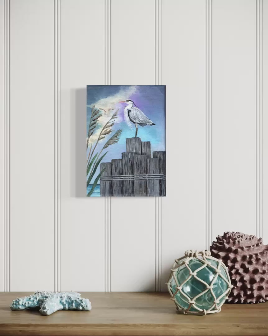 Capture the serene beauty of nature with this original 5 x 7 inch acrylic painting of a gray heron perched on weathered pylons. Painted on stretched canvas, this artwork brings a peaceful coastal scene into your home, evoking the calm of ocean surroundings. Perfect for nature lovers, it adds a touch of tranquility and elegance to any space. Enjoy free shipping within the continental United States and own a unique piece that celebrates the grace of wildlife and the soothing rhythm of the sea. Note: The watermark is for viewing purposes only and is not part of what you will receive.