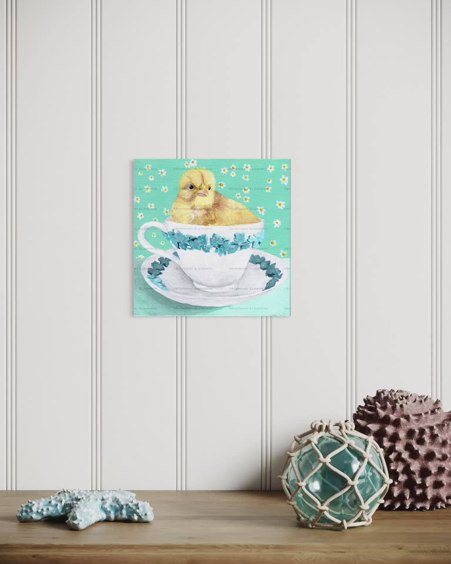 Celebrate spring with this charming original acrylic painting featuring a delicate baby chick nestled in a decorative teacup. Soft blue-green tones and intricate floral embellishments create a whimsical, gallery-worthy piece perfect for any space. This miniature artwork measures 6 x 6 inches, making it ideal for shelves, desks, or gallery walls. Arrives unmatted and unframed, ready for your personal styling. Free shipping included for continental United States orders. Note: The watermark and frame are for viewing purposes only and are not part of what you will receive.