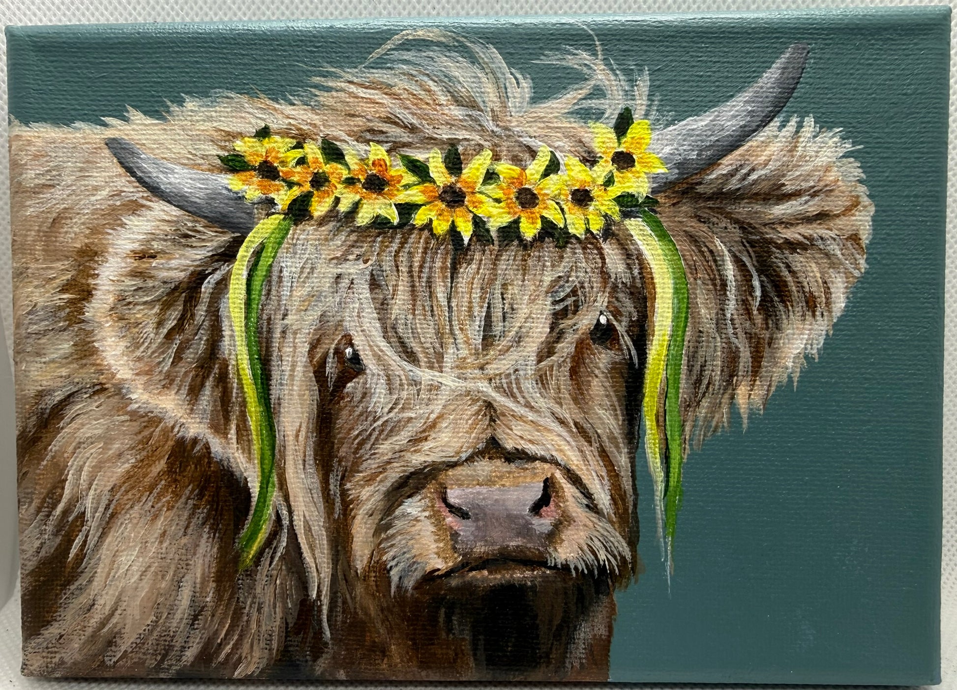 Discover the timeless appeal of this 5 x 7 inch original acrylic painting, showcasing a majestic Scottish Highland cow adorned with an elegant daisy garland and gracefully flowing ribbons. Against a calming green background, this pastoral masterpiece radiates natural beauty and rustic sophistication. Perfect for farmhouse enthusiasts and art collectors alike, it brings warmth and character to any space. Best of all, enjoy complimentary shipping throughout the continental United States—transform your walls with this charming countryside treasure.