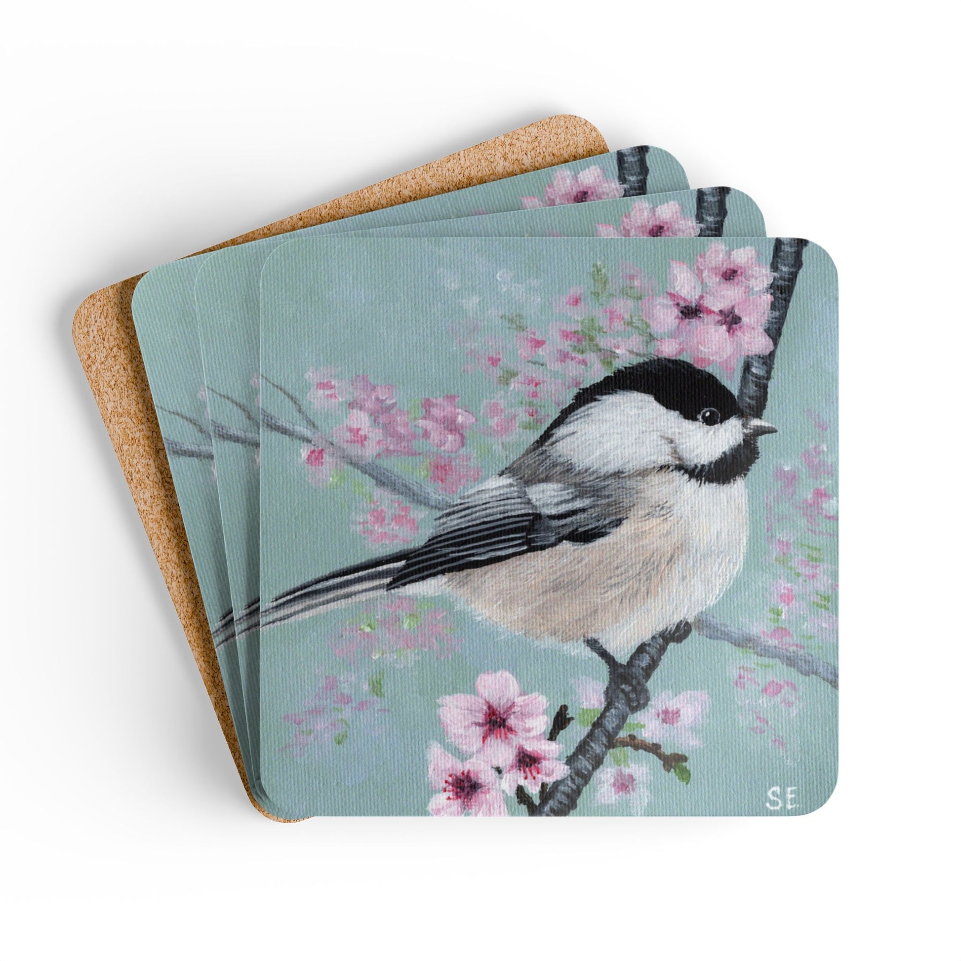 Hand-painted charm meets everyday utility. These square cork-backed coasters carry a soft, painterly chickadee perched among blush cherry blossoms — colors rendered in a glossy, high-definition finish that brightens tabletops without stealing the scene. Thin and lightweight, the set keeps surfaces safe from rings and slips with a natural cork underside, while the durable MDF top holds the vibrant print wash after wash. They sit quietly in a cottage kitchen, on a sunny reading nook side table, or stacked by the coffee station — small moments made a little more beautiful.
