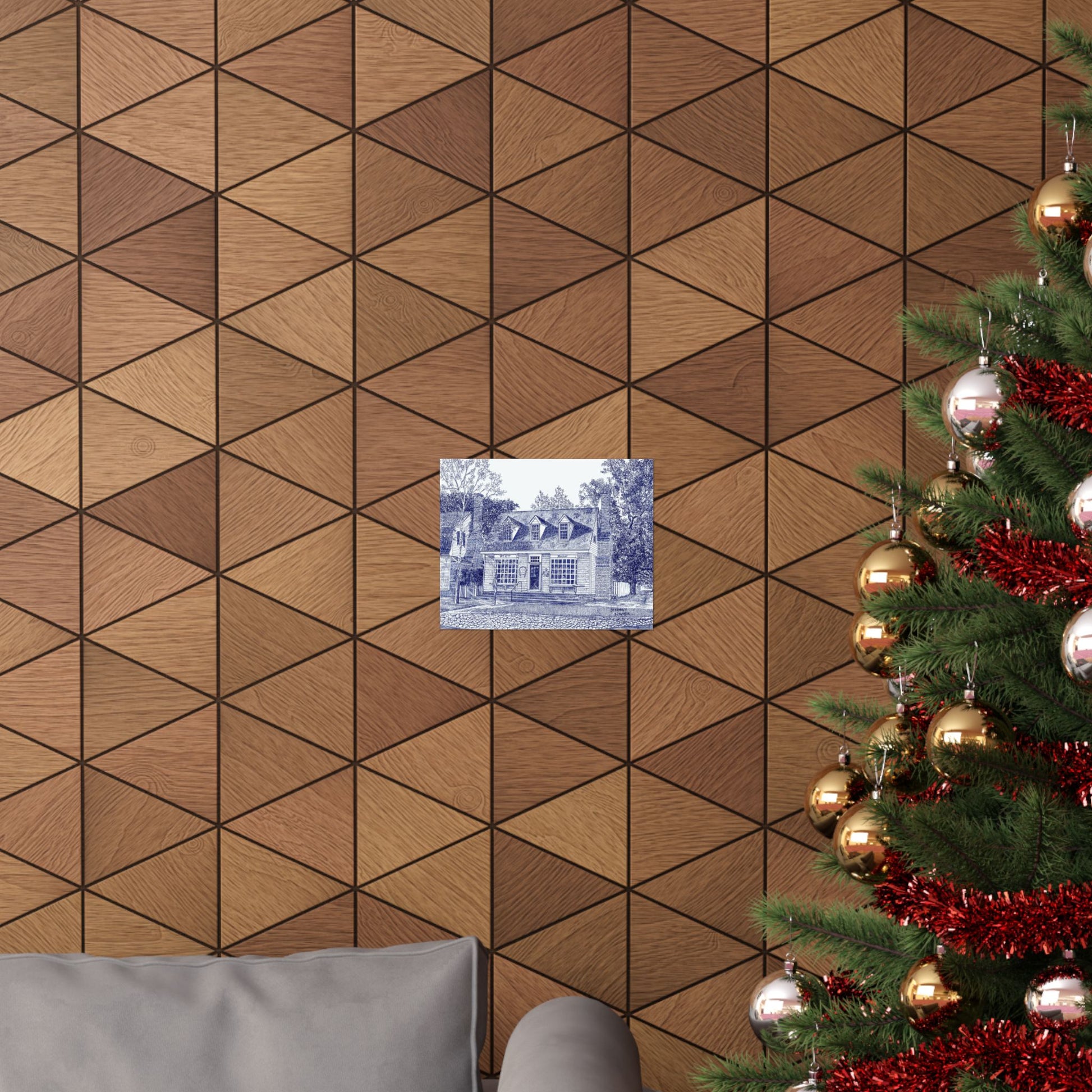 This matte horizontal poster brings a quiet, old-town charm into any indoor space. Printed in deep indigo tones on museum-grade archival paper, the detailed drawing of Colonial Williamsburg's William Pitt Shop and cobblestone street feels like a memory paused in time. The matte finish absorbs glare and invites a close look at the fine giclée printing—every windowpane, brick, and tree rendered with crisp fidelity. It slips naturally into cozy living rooms, study nooks, or gallery walls where collectors of architectural sketches and vintage scenes gather. Hang it above a reading chair or on a hallway gallery rail to evoke slow afternoons, neighborhood strolls, and the tactile calm of hand-drawn detail during housewarmings, quiet celebrations, or when you simply want your space to feel thoughtfully curated.