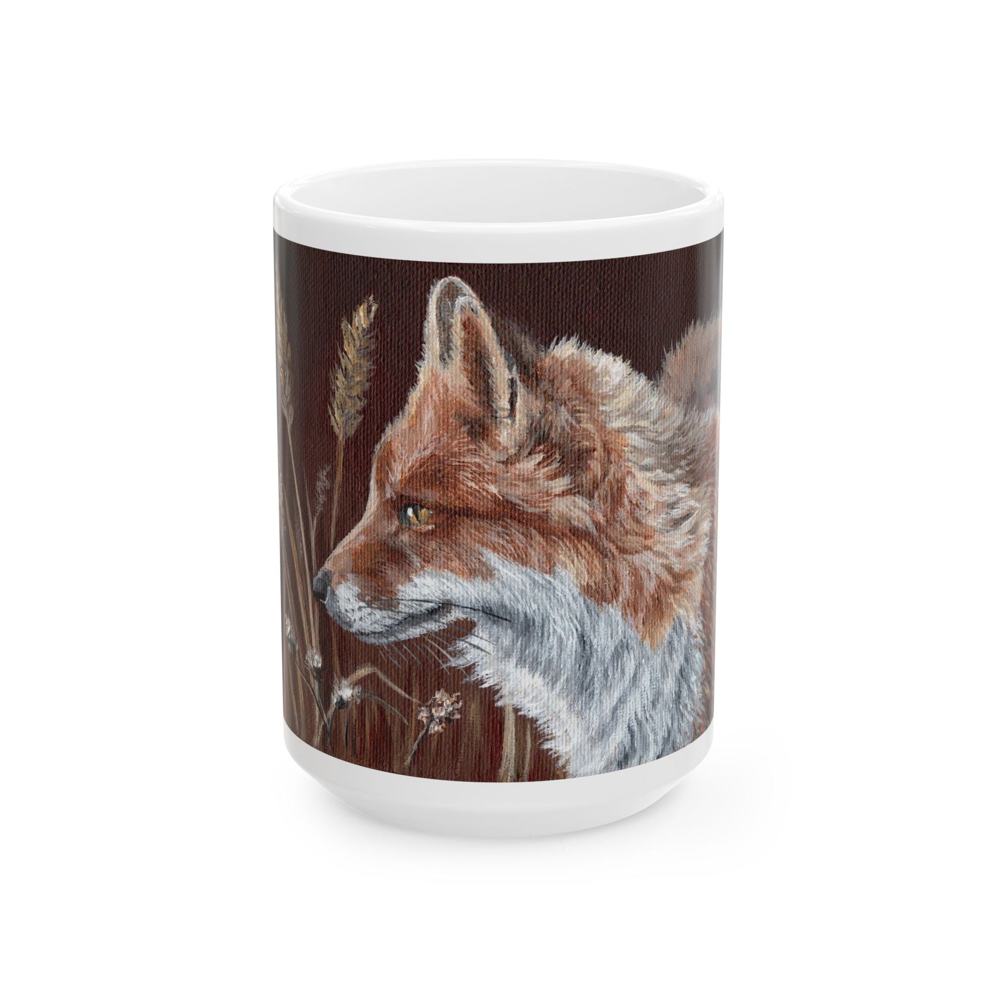 Warm, quiet mornings with a steaming drink in hand. This glossy ceramic mug features a finely detailed fox portrait set against muted grasses and wood tones — a soft, rustic illustration that catches the light and calms the senses. It feels like a small ritual: wrap your hands around the C-handle, inhale the first sip, and let the woodland scene slow you down. The durable white ceramic keeps the artwork vivid, while the shiny finish makes each brushstroke pop. It’s a companion for slow coffees, early sketches, and evenings by a lamp when you want something gentle and familiar on the table.