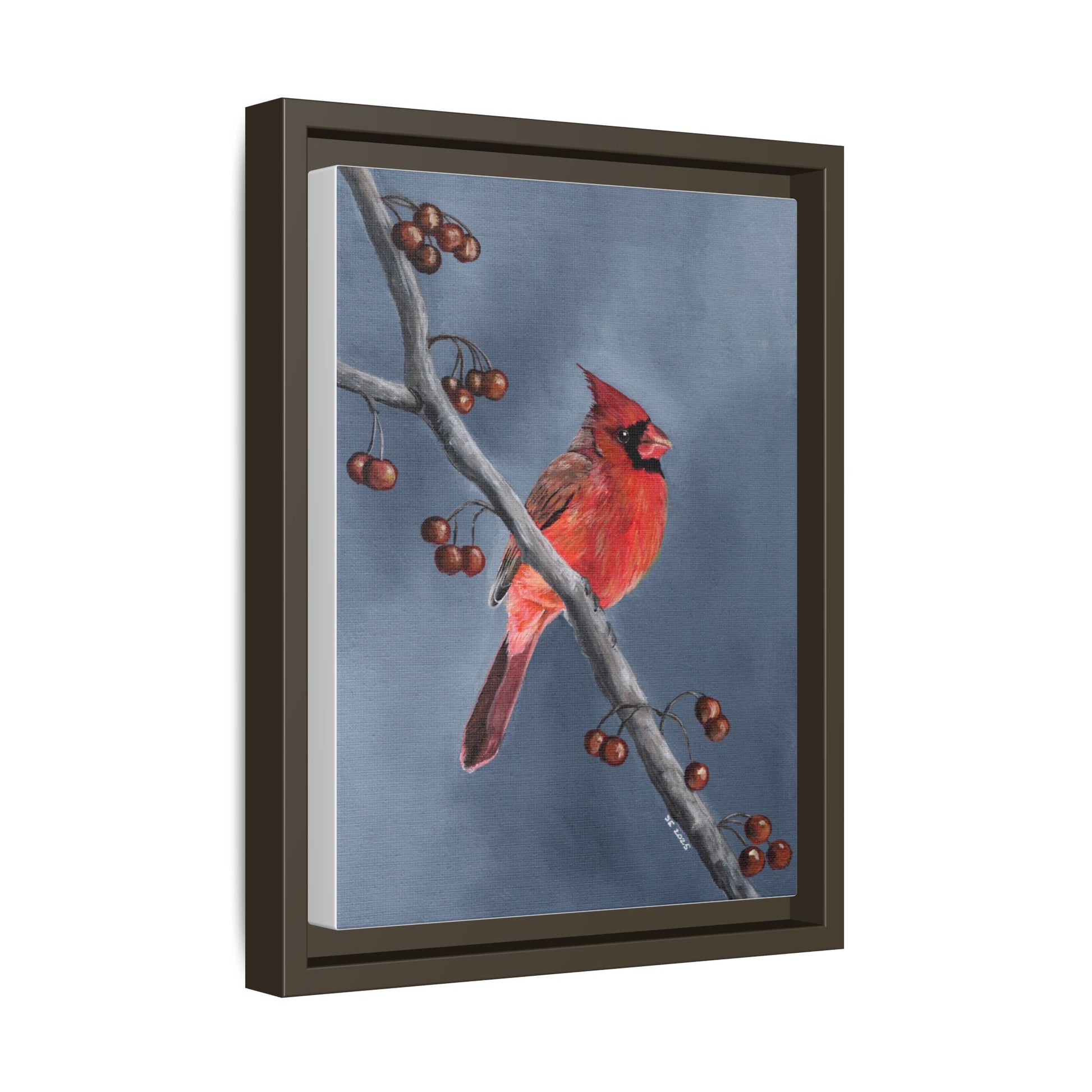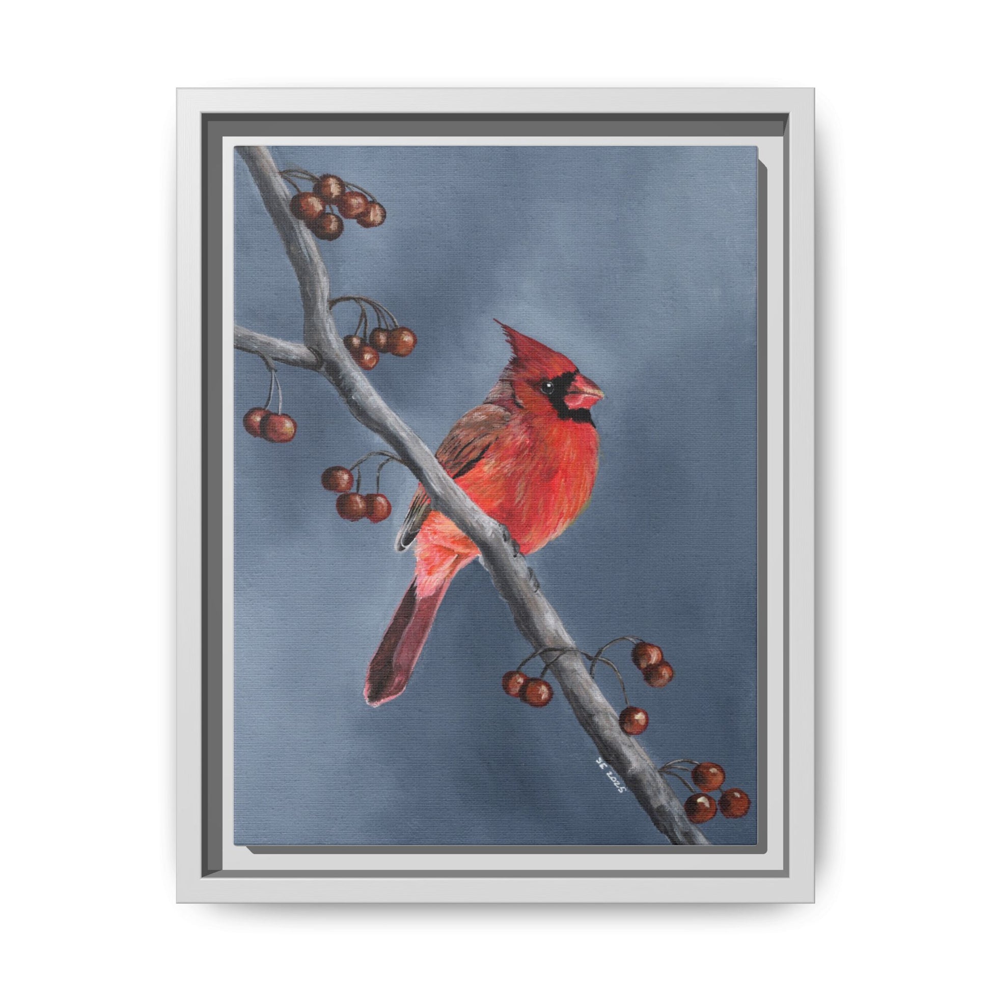 A quietly elegant framed matte canvas featuring a red cardinal perched on a slender winter branch. The painterly brushstrokes and muted blue-gray background give it a soft, contemplative mood—like a brief, bright visitor on a cold morning. Hung in an entryway, living room, or reading nook, it draws the eye without shouting, adding a thoughtful note of nature and memory to a calm interior.