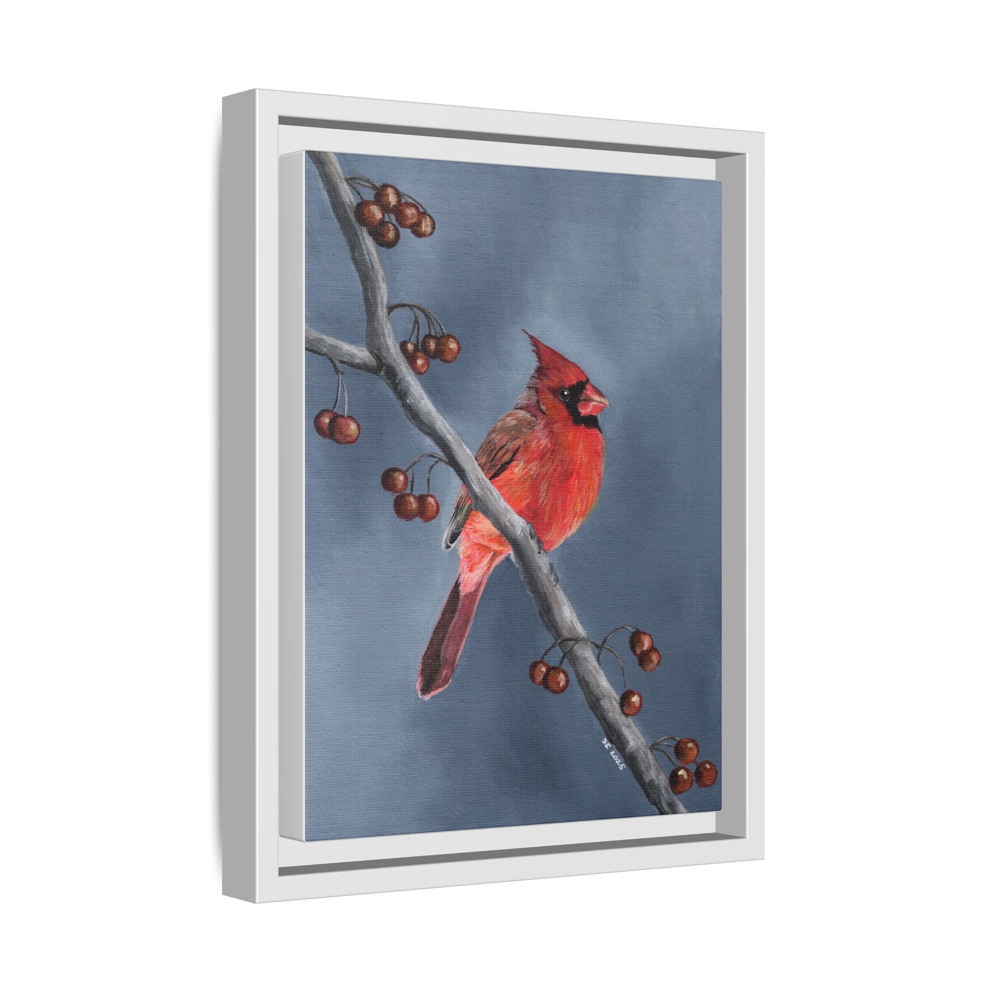 Framed Cardinal Canvas Art – Red Northern Cardinal on Winter Branch