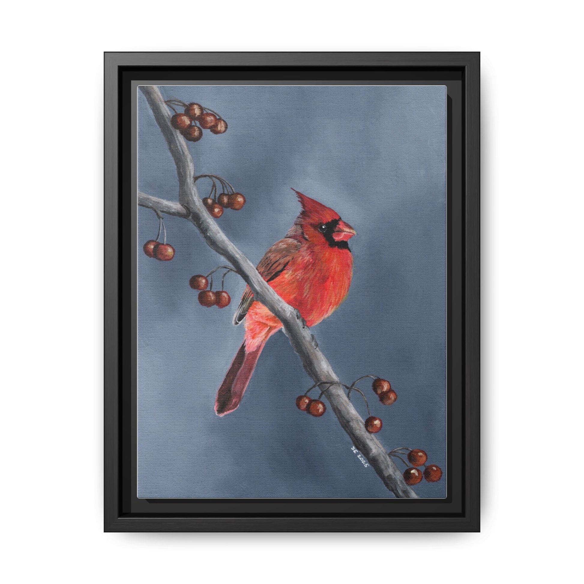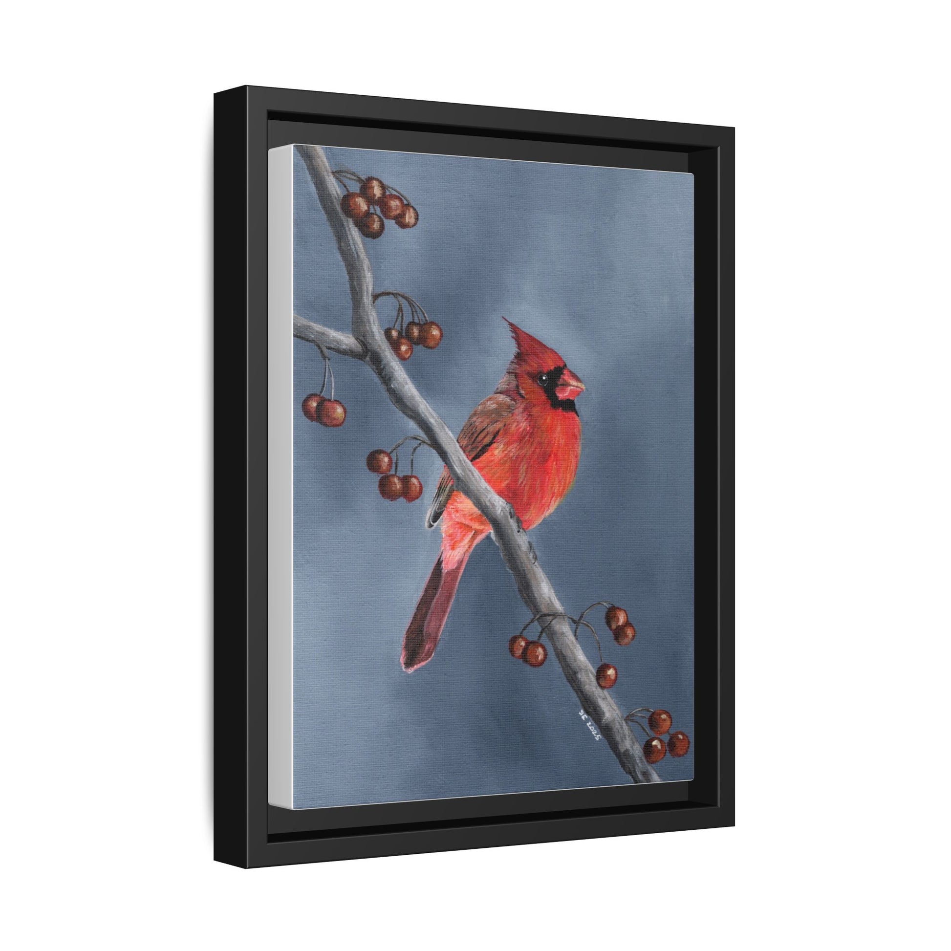 This piece suits anyone who finds comfort in nature’s small moments: birdwatchers, seasonal decorators, and those who favor understated, artful accents. The deep black frame and satin matte finish keep the focus on the cardinals’ warm tones, letting the artwork integrate with modern, farmhouse, or cottage-style decors. It works particularly well when paired with warm woods, wool throws, and layered lighting for cozy winter evenings or quiet holiday displays.