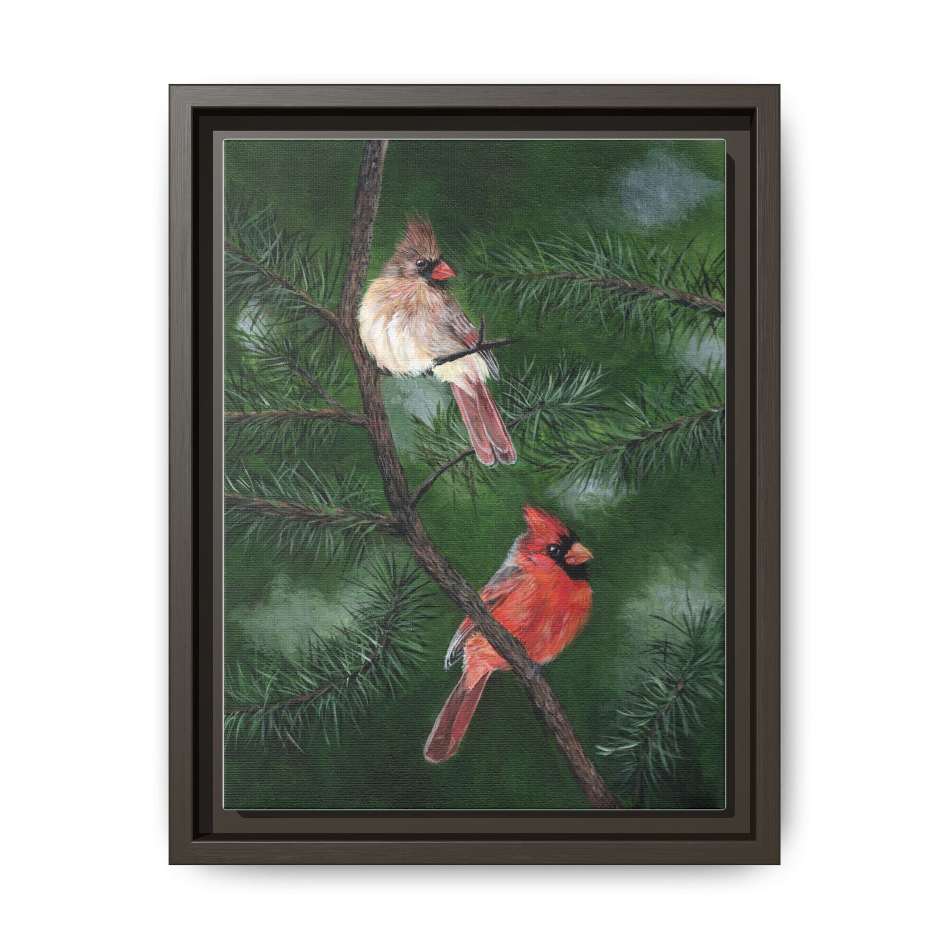 A framed matte canvas print that brings quiet woodland moments into your home. Two cardinals perch among soft pine needles, painted with rich, layered color that reads warm and natural against the deep green background. The image sits on a finely coated cotton-poly canvas stretched over sustainably sourced pine and finished with a slim, modern frame — ready to hang with included sawtooth hardware. It’s the kind of piece that settles into a living room, entryway, or den and rewards slow looking: the brushy texture, subtle color shifts, and mindful composition invite calm and a connection to the seasons.