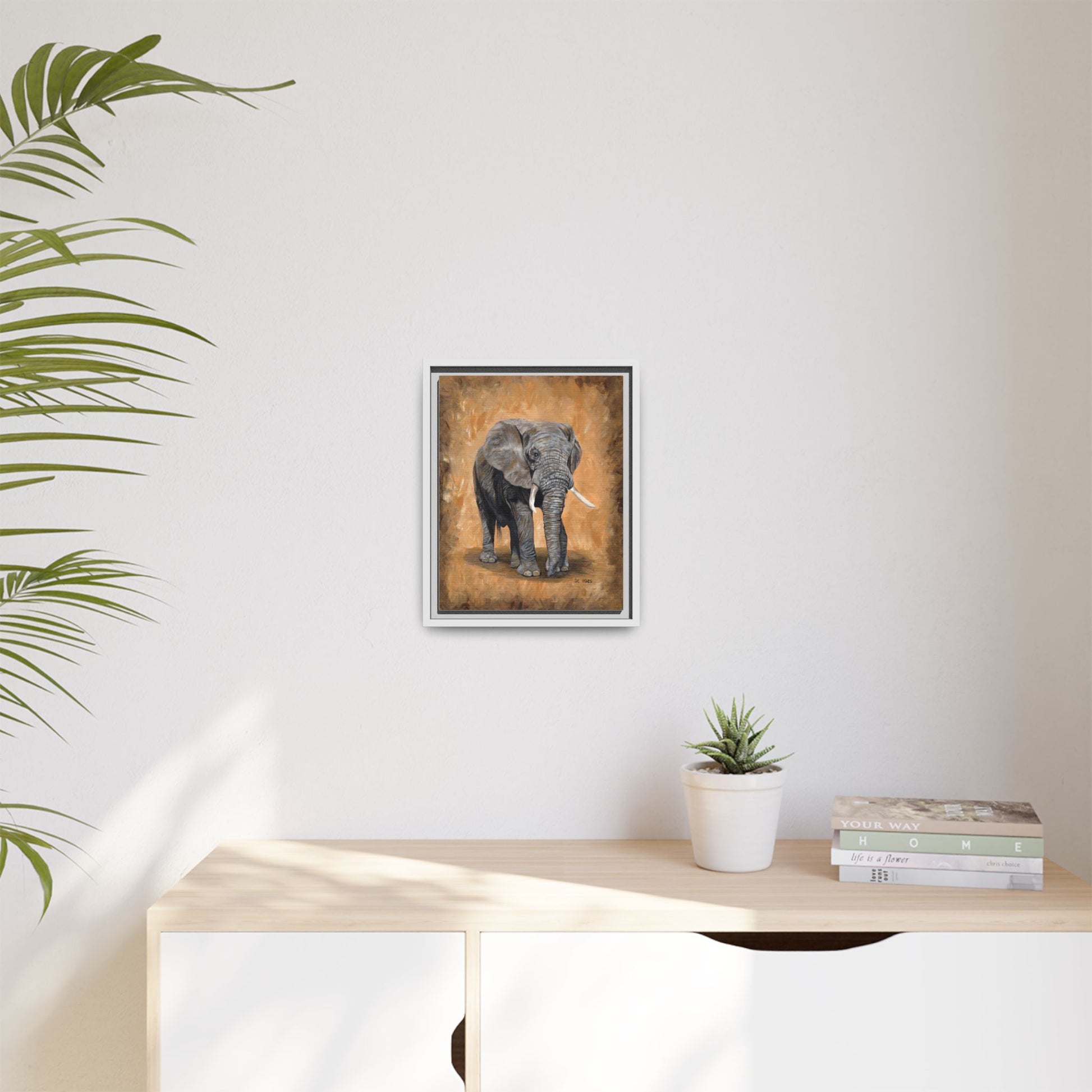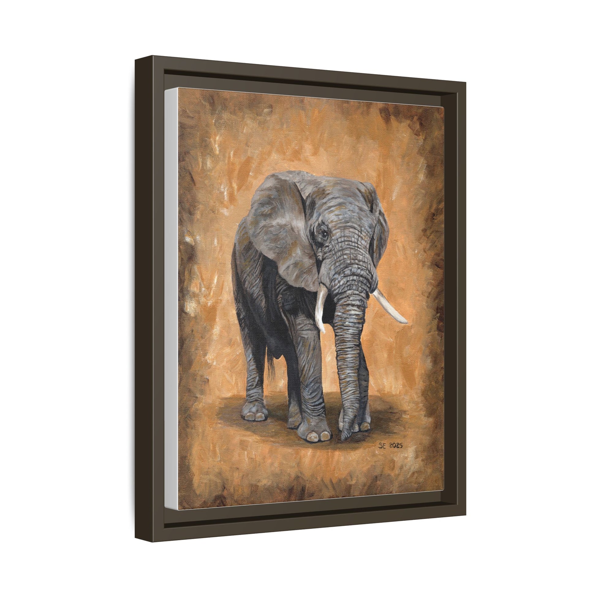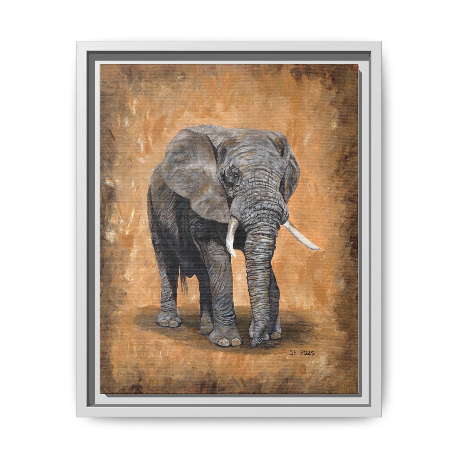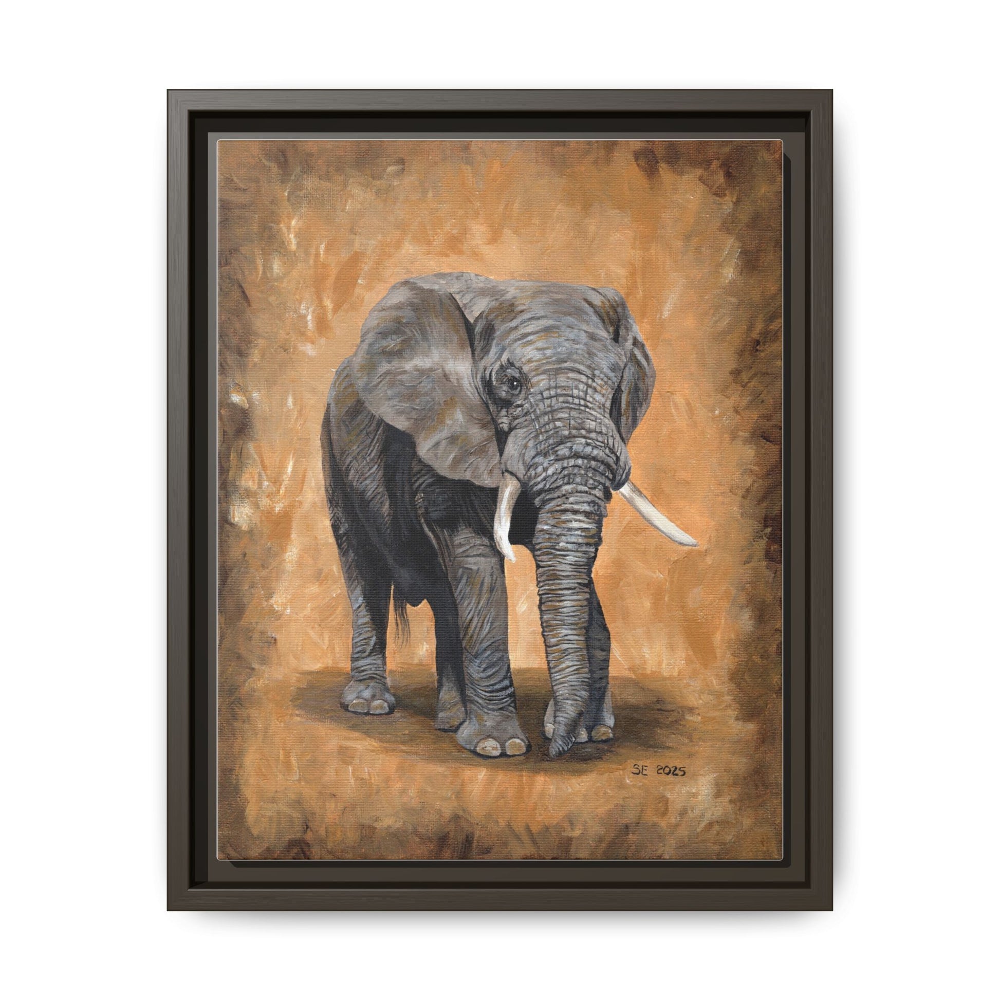 Warm, grounded, and quietly powerful — this matte canvas framed print brings a gentle presence into any room. The hand-painted style elephant stands against a textured amber backdrop, its soft brushstrokes and rich neutrals giving the piece a timeless, gallery-quality feel. Framed in a slim pine profile with a matte finish, the work reads like a lived-in studio painting that’s ready to hang. It settles into living rooms, studies, or nurseries where calm, natural energy is wanted; it complements wood tones, leather, and layered textiles while adding a focused focal point that never shouts. Choose vertical, horizontal, or square proportions to suit your wall; sawtooth hardware is included so installation is straightforward and secure.
