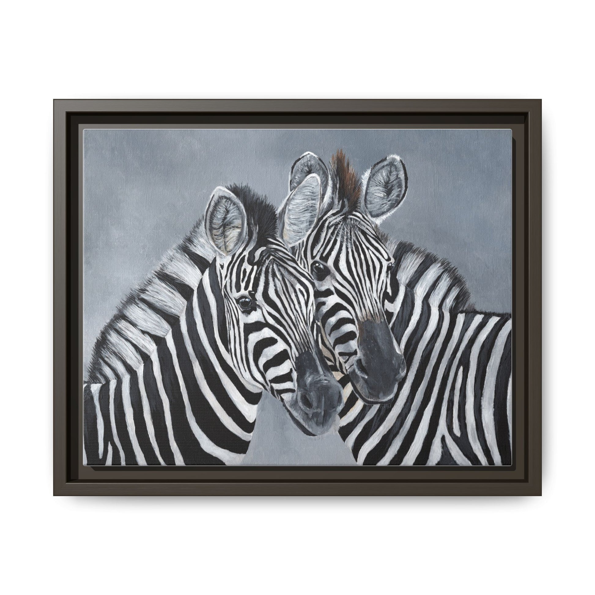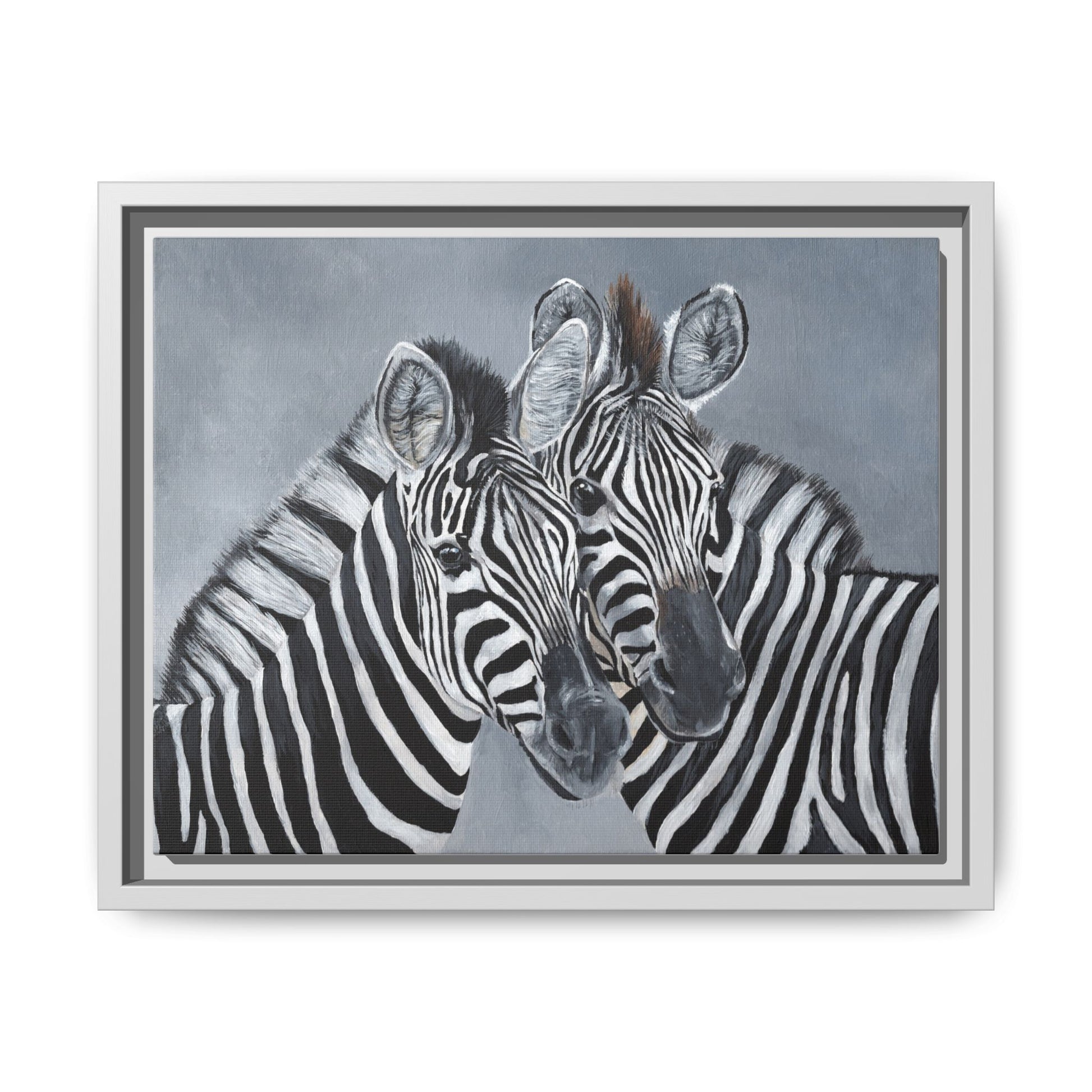 A framed matte canvas print that brings quiet presence and natural elegance to any room. Two zebras lean into each other against a soft, muted background—their black-and-white stripes rendered in crisp detail and rich contrast. The matte finish removes glare and deepens the tones, while the black pine floater frame adds a contemporary edge and dimensional depth. It hangs confidently in living rooms, nurseries, or entryways and feels like a collected piece rather than a fleeting trend. The sustainable materials and high-quality inks ensure the image stays vivid without off-gassing or shine, so the artwork reads beautifully from across the room and up close on calm, reflective afternoons.