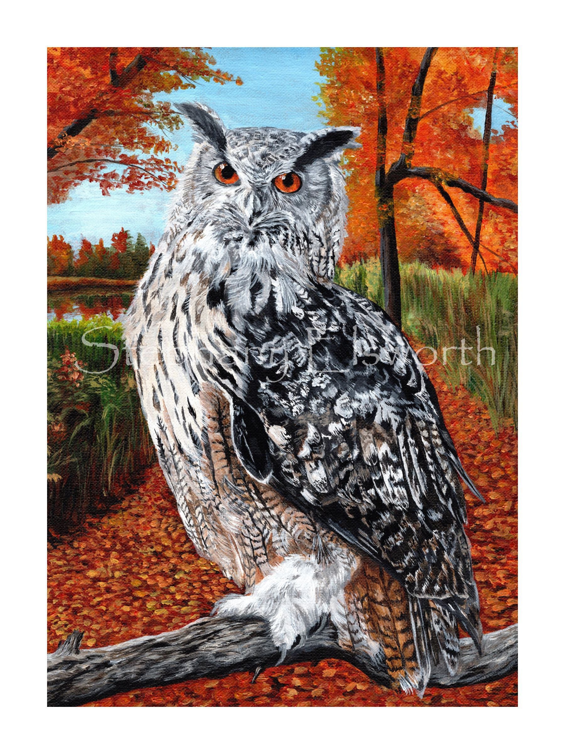 The Owl in Autumn Forest fine art giclee print is available in 6 x 8, 8 x 10, or 11 x 14 sizes, making it a perfect addition to any room or gallery wall. The watermark is only visible for preview purposes and does not appear on the final print. Each piece is delivered in a protective plastic sleeve with a backer, ready for matting and framing. Printed on demand, please allow 1-2 weeks for production, shipping, and delivery. Free shipping in the continental United States only.