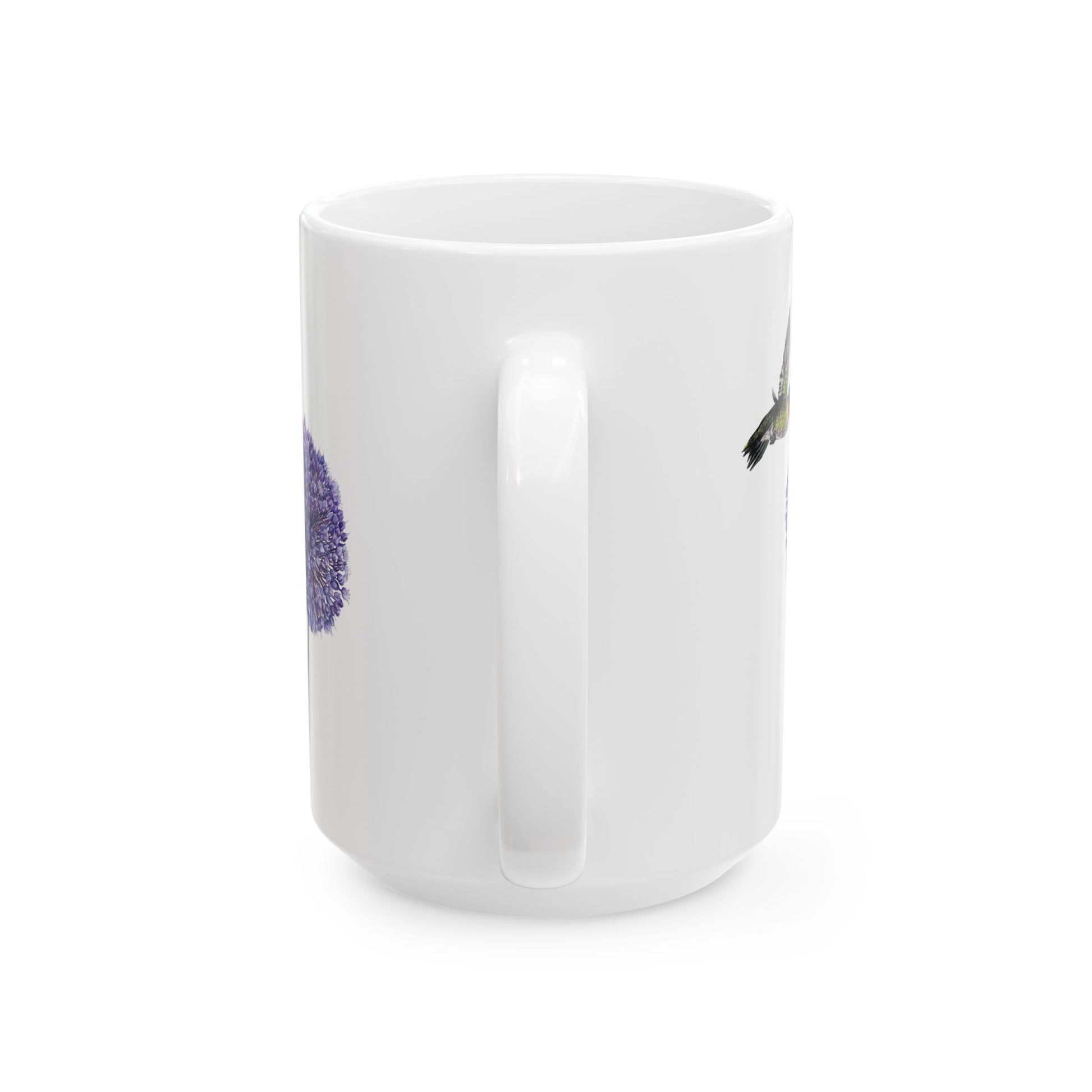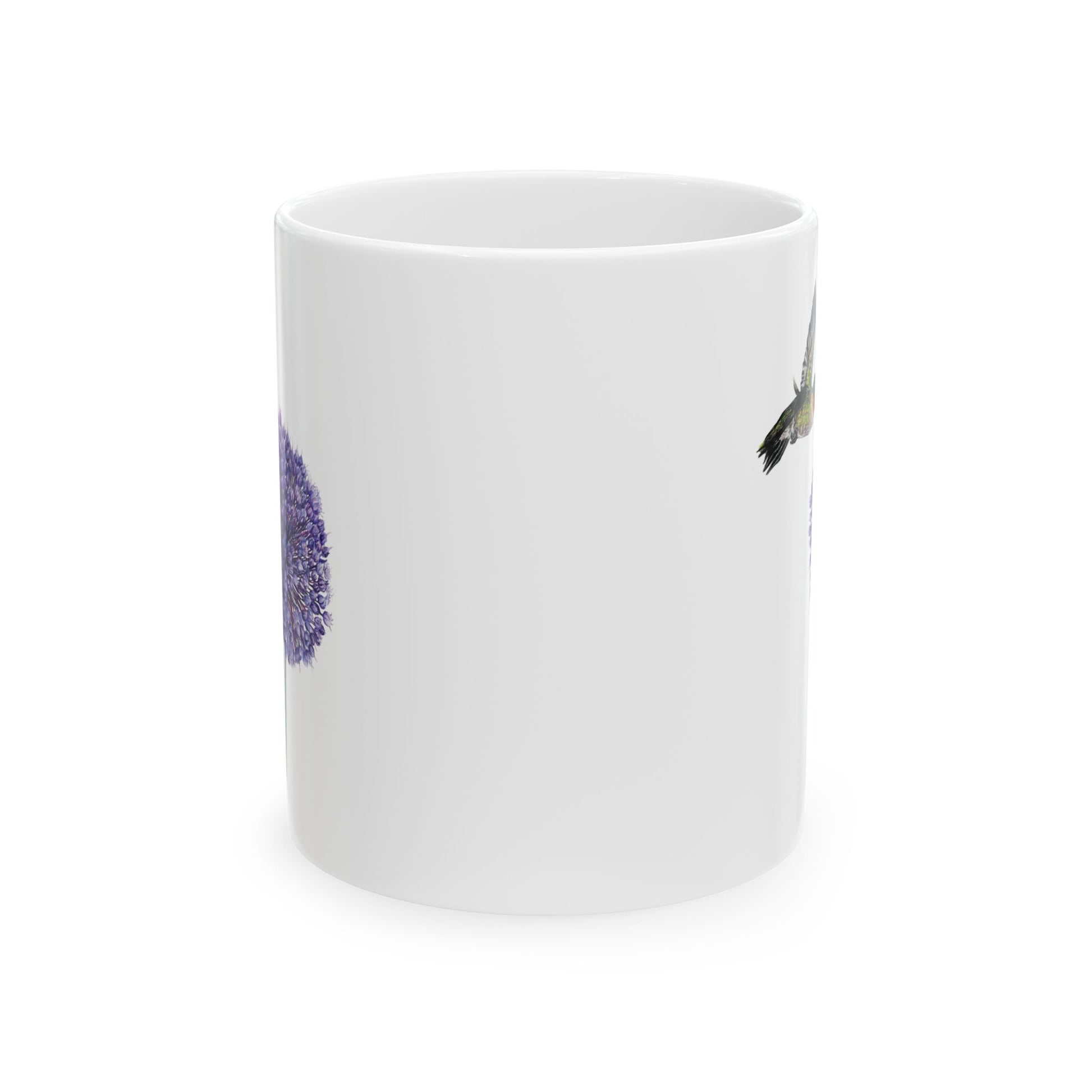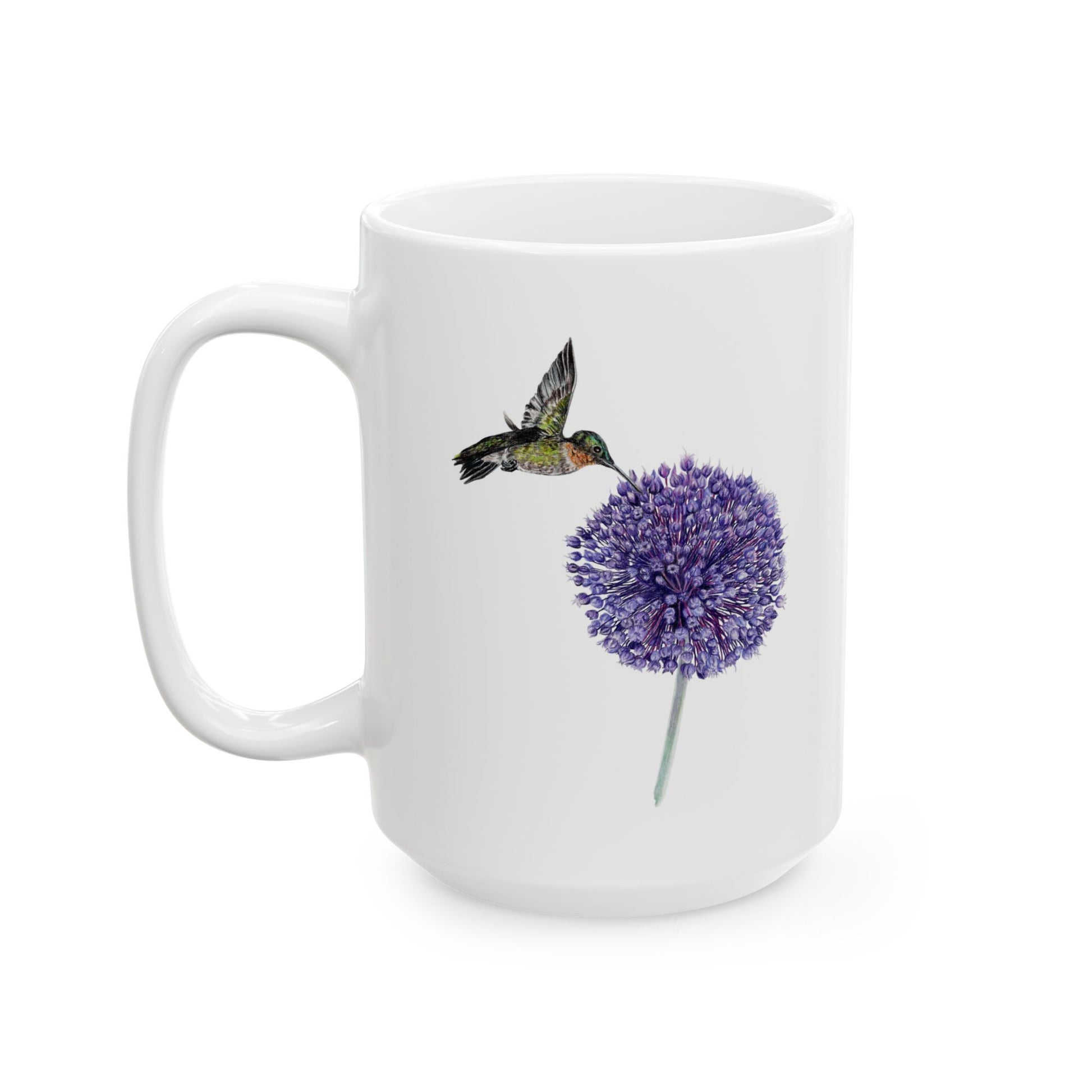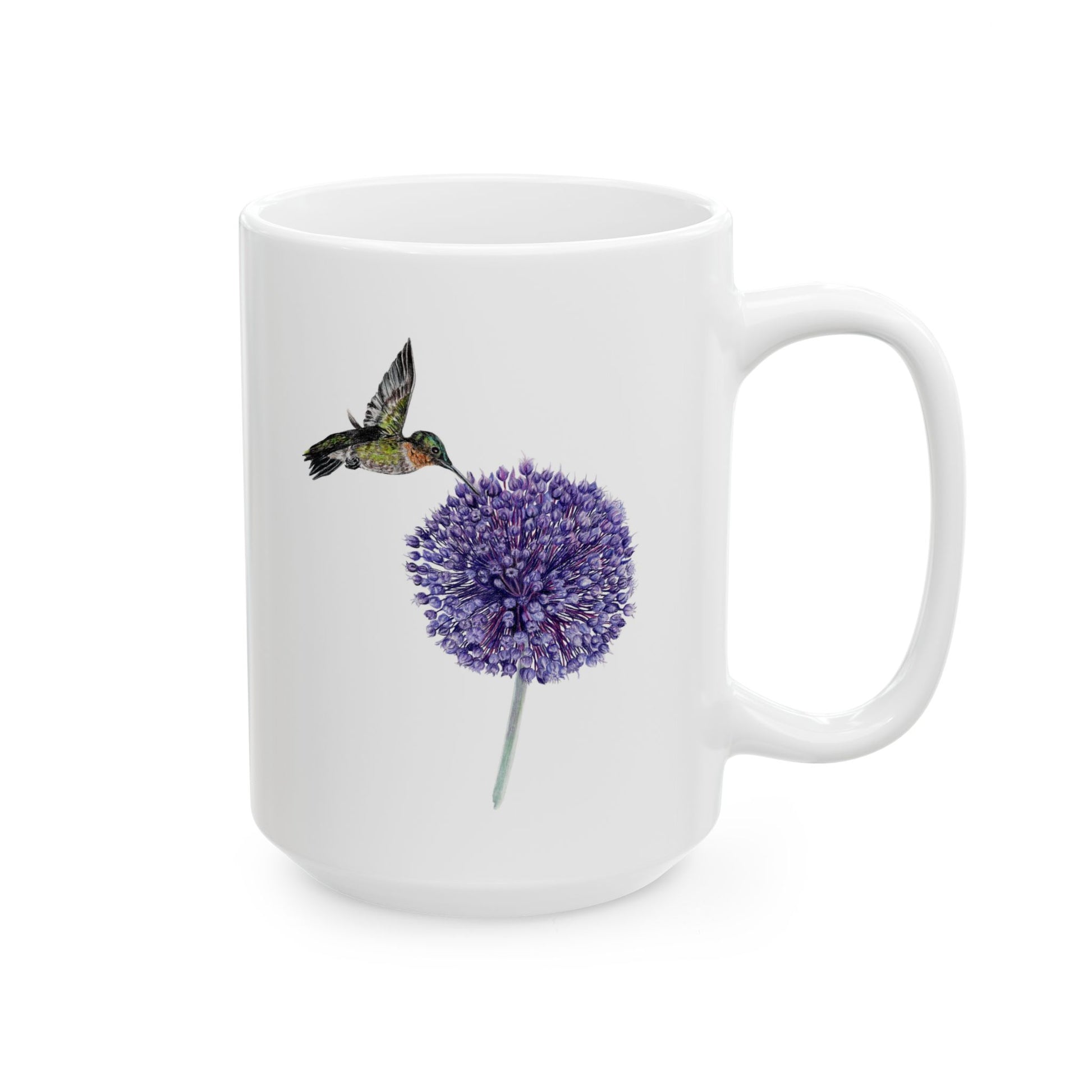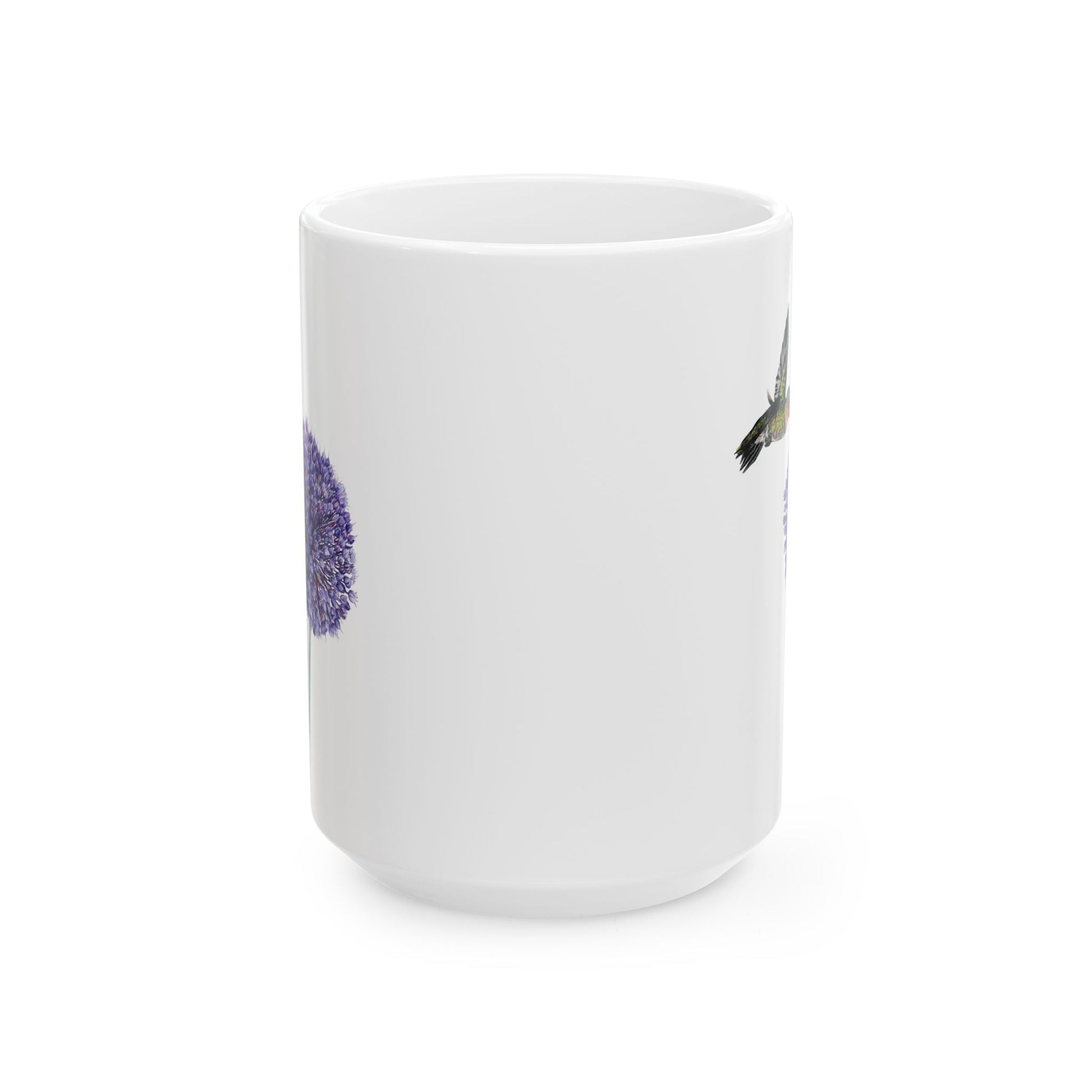 Hummingbird and Yorktown Onion Ceramic Mug — Purple Allium Floral & Hummingbird Coffee Cup (11oz & 15oz)