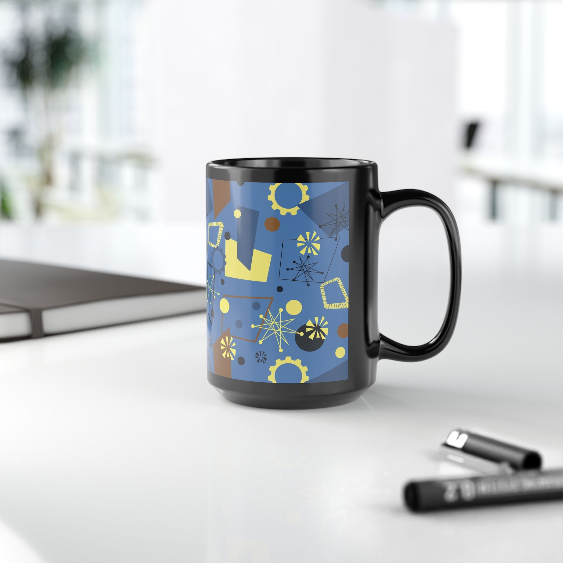 A glossy black ceramic mug wrapped in a playful mid-century modern pattern. Deep navy-blue background with mustard-yellow, teal, rust, and black geometric shapes — starbursts, gears, squares and dots — creates a lively, retro-lounge vibe. The interior and C-shaped handle are black for a seamless, sophisticated look. Durable glazing keeps the colors vivid through everyday use while smoothing the surface for comfortable sipping. Use it for morning coffee, late-night tea, or as a cheerful desktop catchall—this mug brings a bit of vintage design energy to daily routines and small moments of focus.
