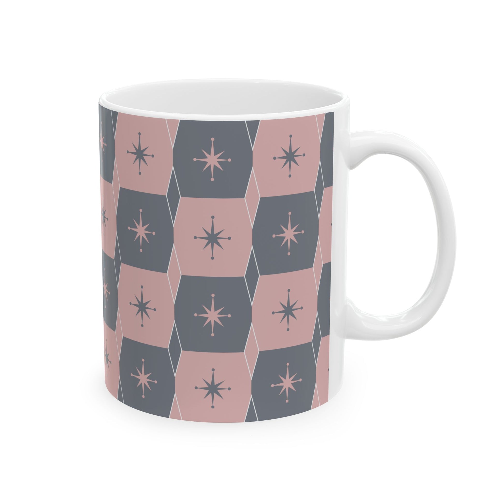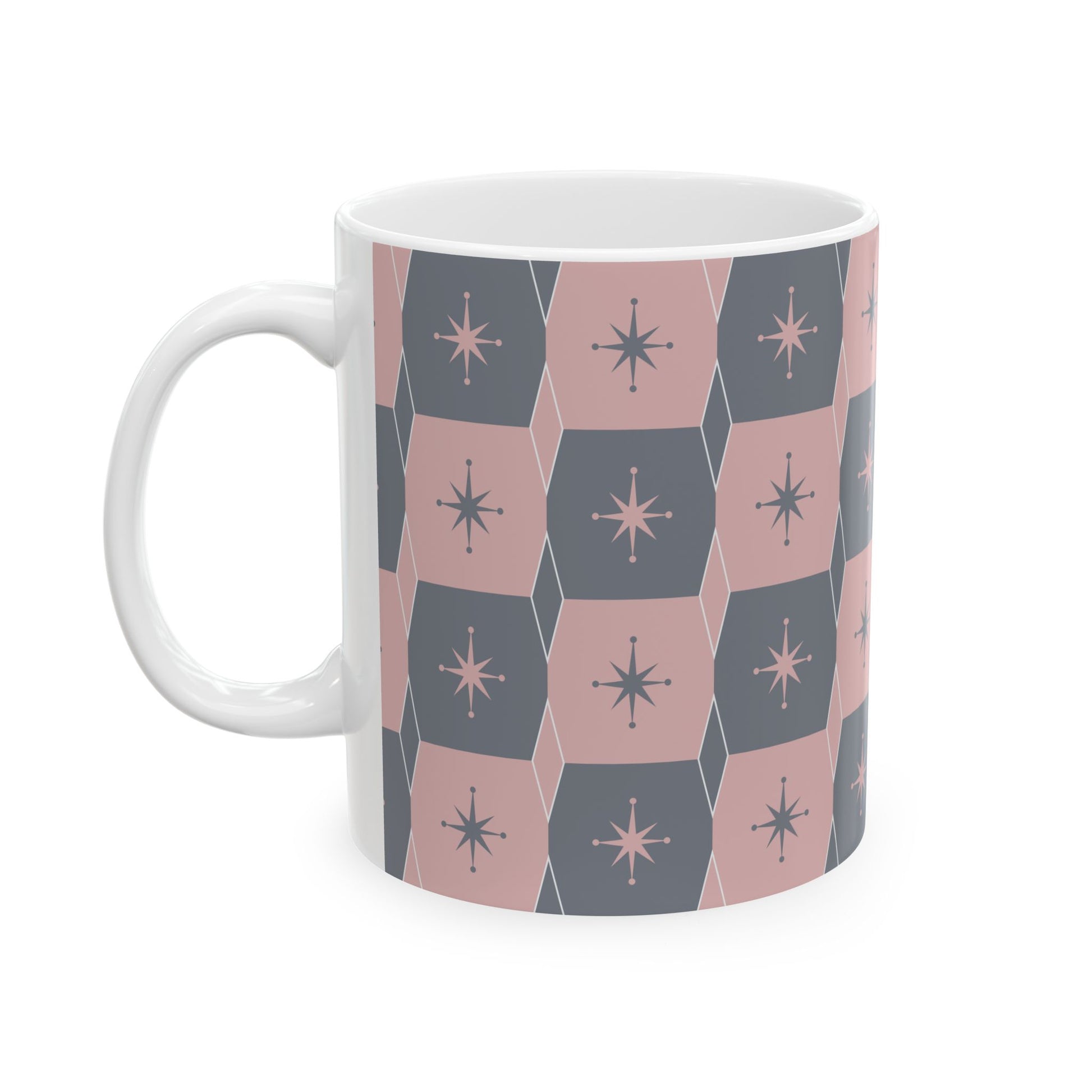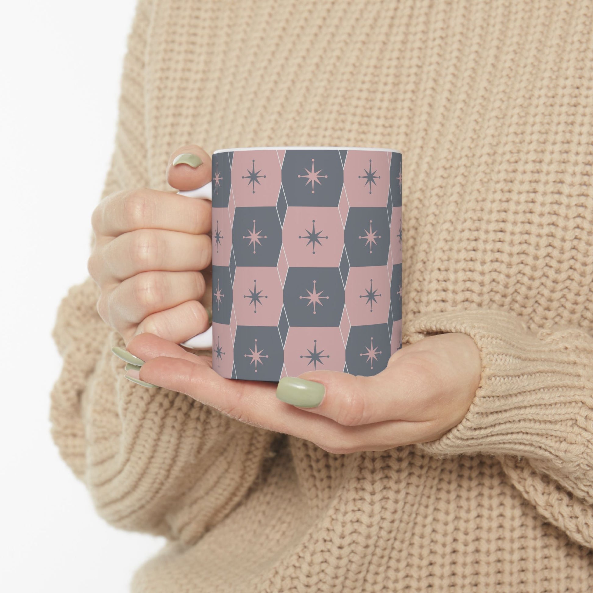 This ceramic mug brings a quiet, modern-retro calm to your morning ritual. Muted rose and slate hexagons wrap around the glossy white body, each inset with a delicate starburst that feels like a tiny vintage finding—subtle, stylish, and quietly confident. It warms hands and mood the same way a slow playlist and soft light do: familiar, steady, and thoughtfully designed. Slide it onto your desk during a creative stretch, keep it on the kitchen shelf for slow weekend coffee, or let it stand out on a bedside tray for tea before bed. The pattern reads as mid-century-modern with a contemporary softness—made for people who notice small details and collect moments rather than noise.