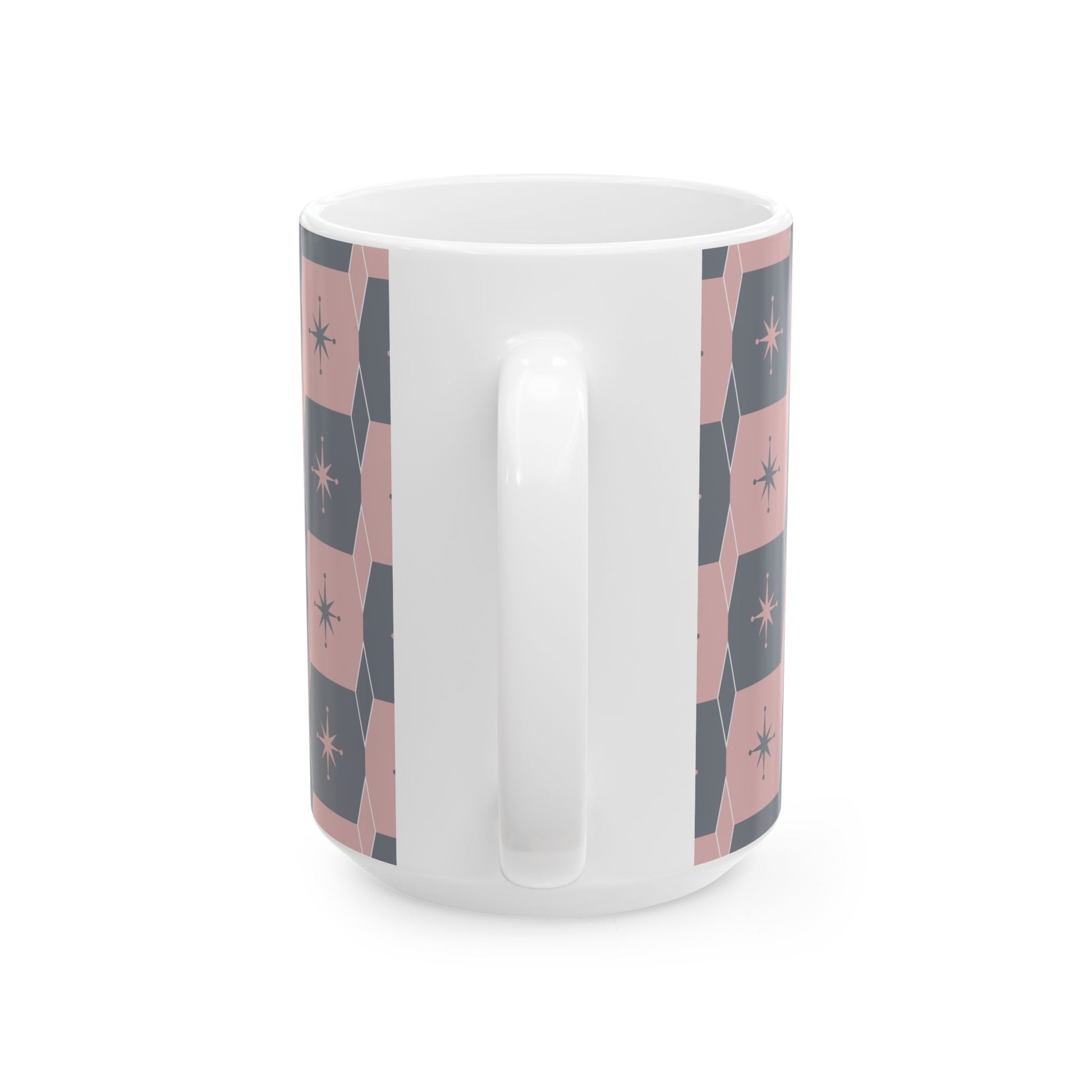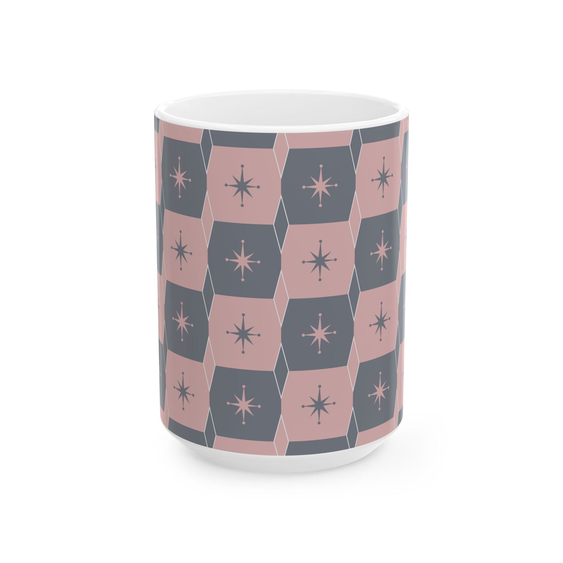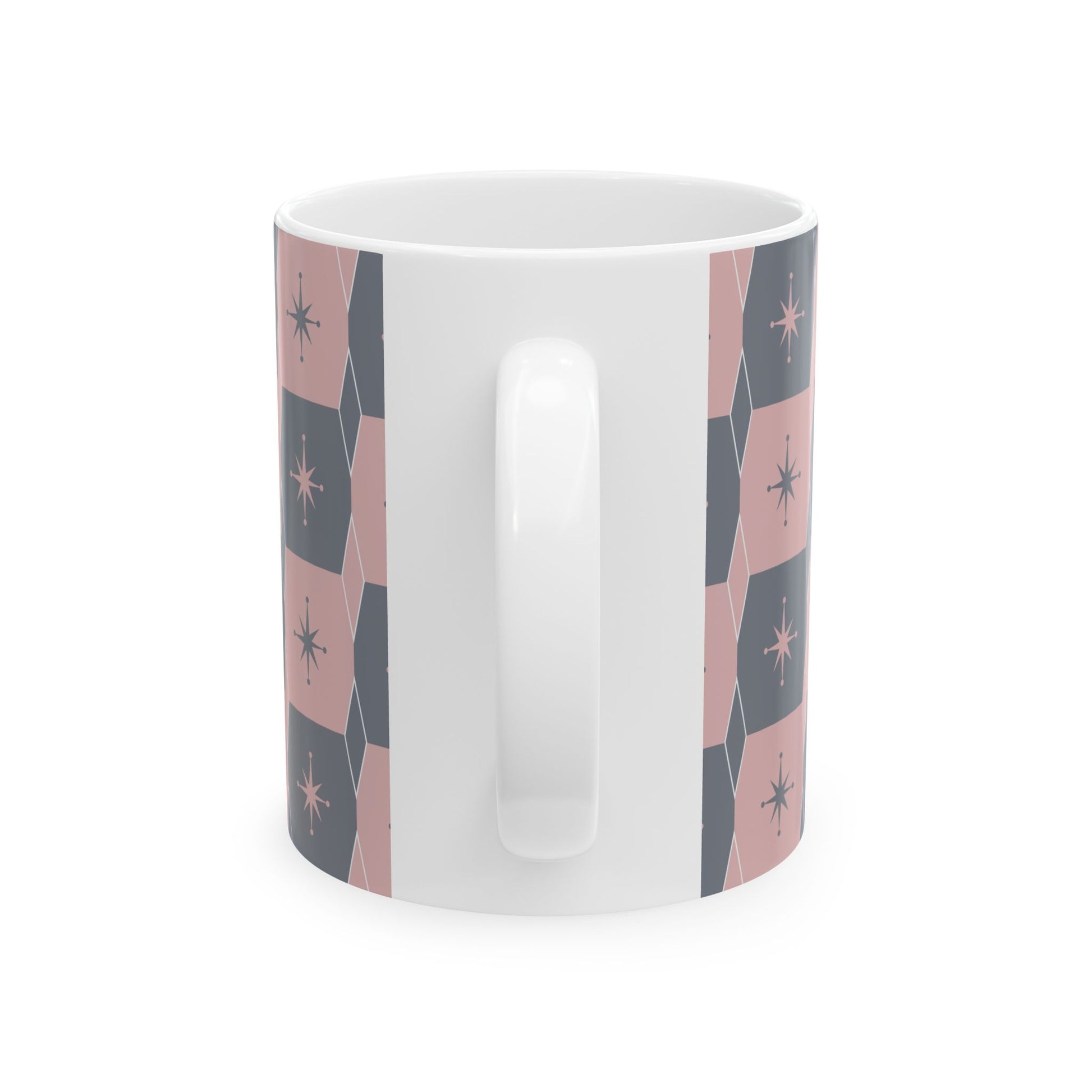Mid-Century Starburst Ceramic Mug — Pink & Slate Geometric Pattern (11oz, 15oz)