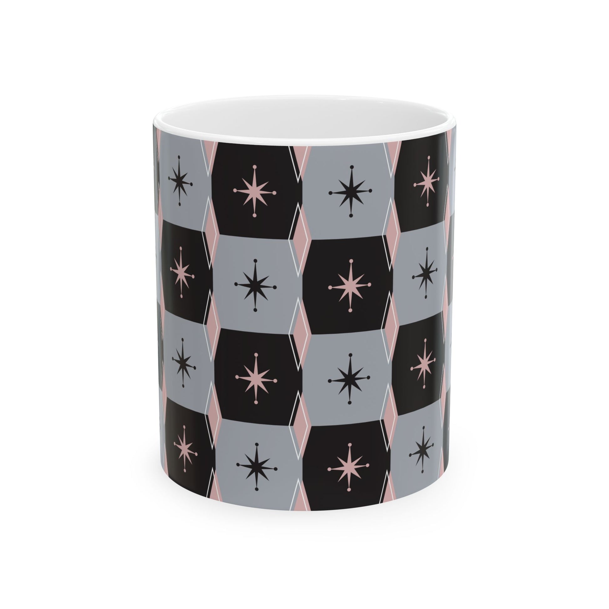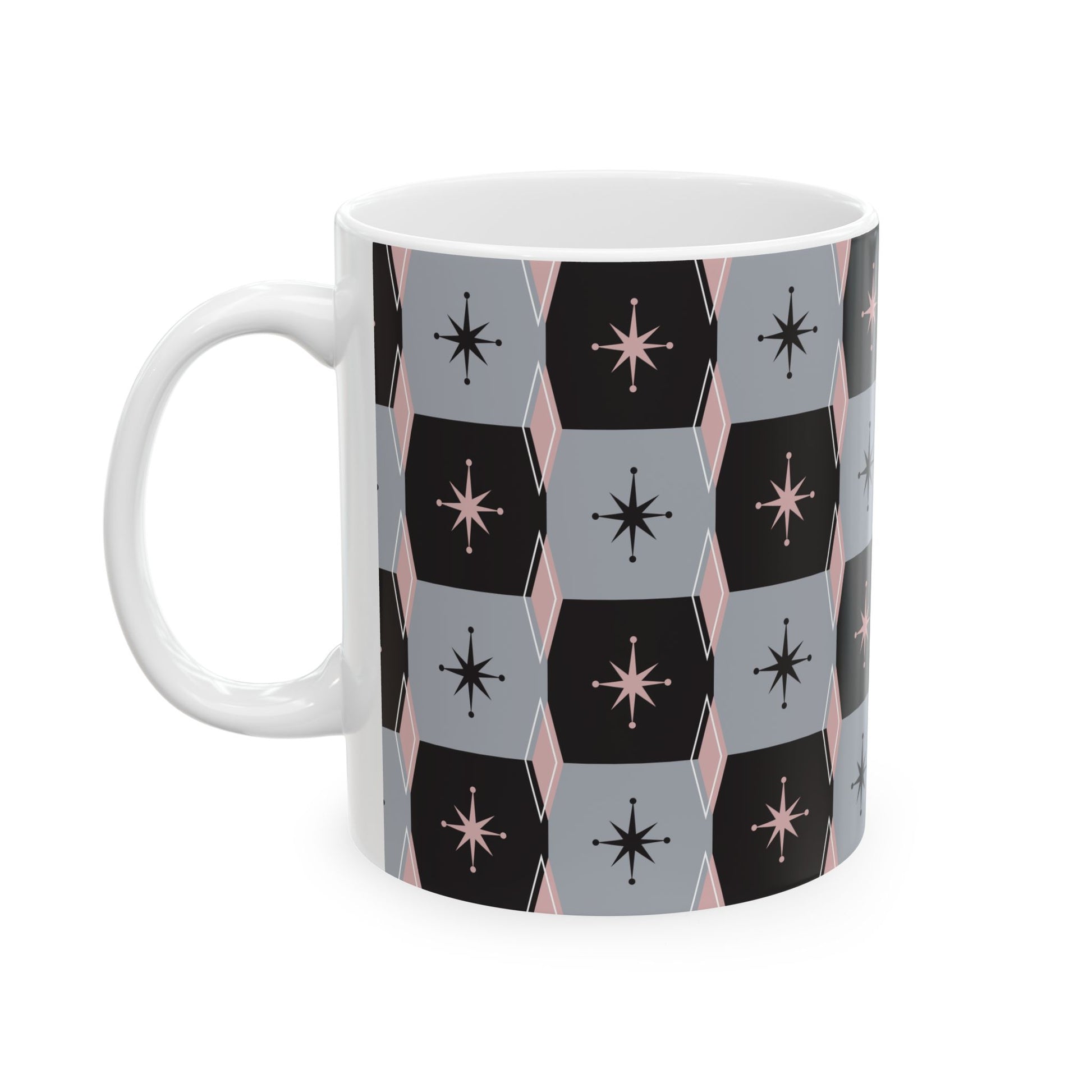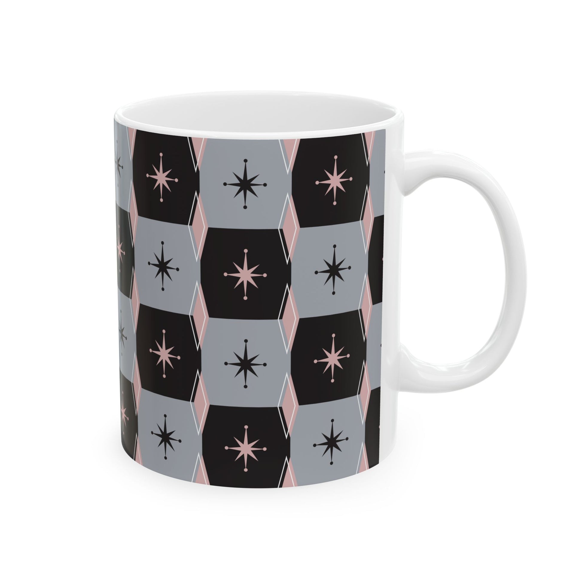 Wrap your morning ritual in subtle mid-century charm. This glossy ceramic mug wears a repeating hex pattern in soft slate, muted black, and blush accents, with small starbursts tucked into each tile. It feels calm and curated on the counter—an understated companion for slow sips, sketchbook mornings, or quiet coffee breaks between tasks. The comfortable C-handle and smooth finish make it easy to reach for again and again, while vibrant, fade-resistant printing keeps the design crisp through daily use. Give your kitchen a small, thoughtful update or tuck one into a cozy brunch spread; it blends with modern vintage, minimalist, and retro-inspired spaces alike.