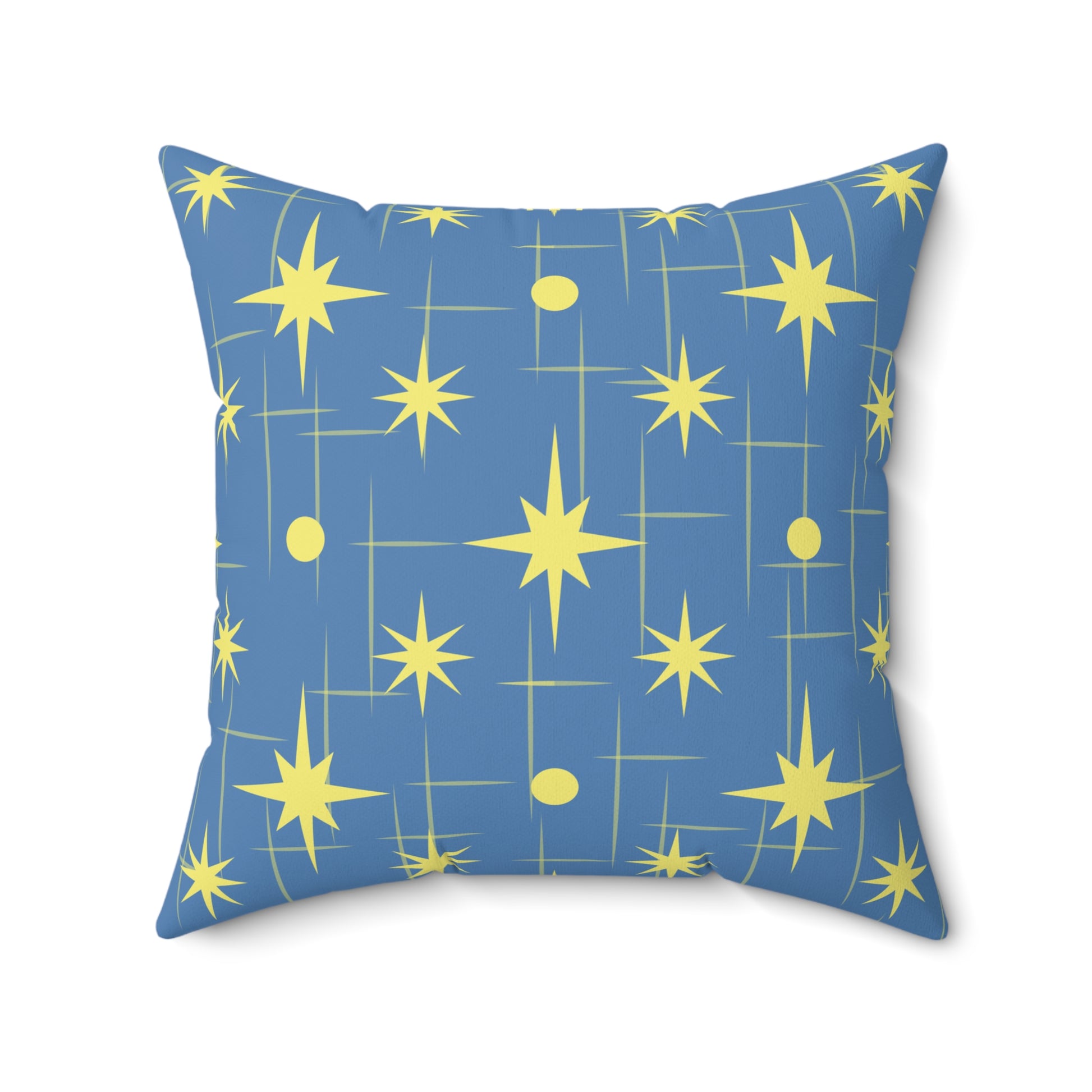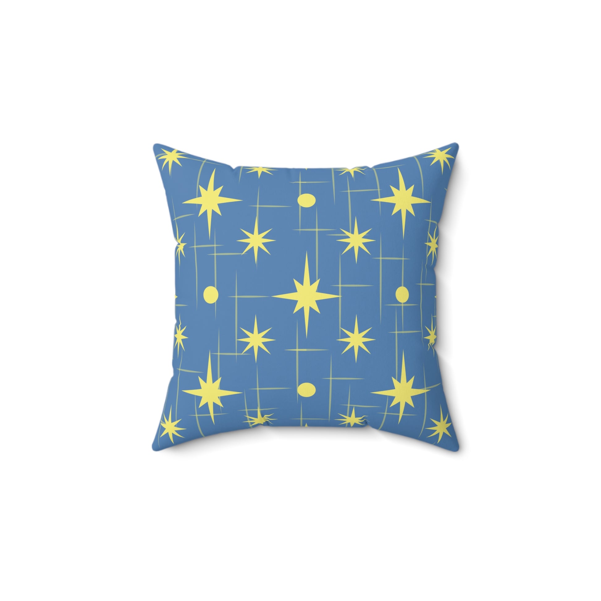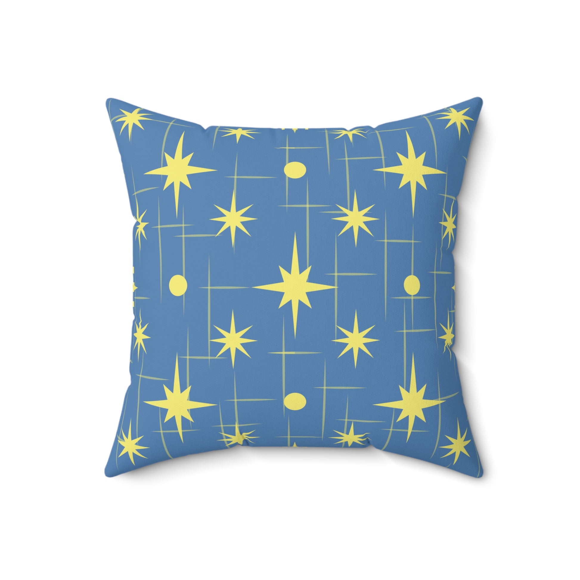 A lively spun polyester square pillow printed both sides with a vintage-inspired starburst pattern in sunny yellow on a muted blue field. The graphic brings mid-century modern energy to a couch, reading nook, or bedside chair — bright and playful without shouting. The cover keeps its shape and resists wrinkles, while the recycled polyester insert ships vacuum-packed so you receive extra loft when you stuff the cover. Subtle concealed zipper and coordinated beige pull let the design remain uninterrupted. This pillow layers easily with textured throws and woven cushions to add a pop of retro night-sky charm to everyday spaces or seasonal décor moments like cozy winter evenings and holiday gatherings.