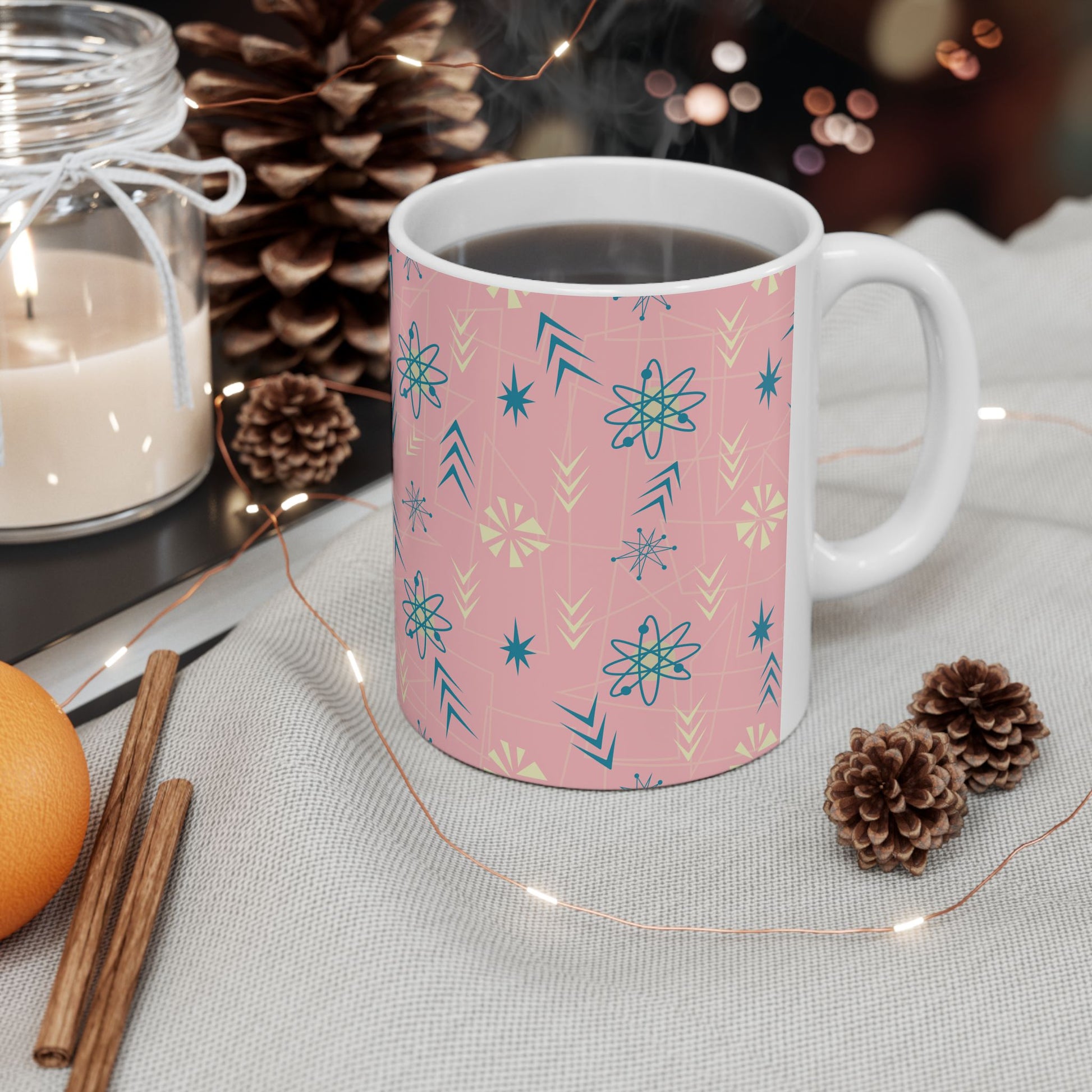 A glossy ceramic mug wrapped in a soft pink pattern of abstract stars, chevrons, and retro floral motifs. It feels like a gentle morning ritual—warm coffee, a favorite sweater, and a quiet moment at the kitchen table. The artwork leans vintage-modern with playful, hand-drawn shapes in teal, navy and pale yellow that add a cheerful, calming note to your drinkware. Sized for everyday use, this mug brings a subtle pop of color to work desks, reading nooks, or cozy brunches with friends.