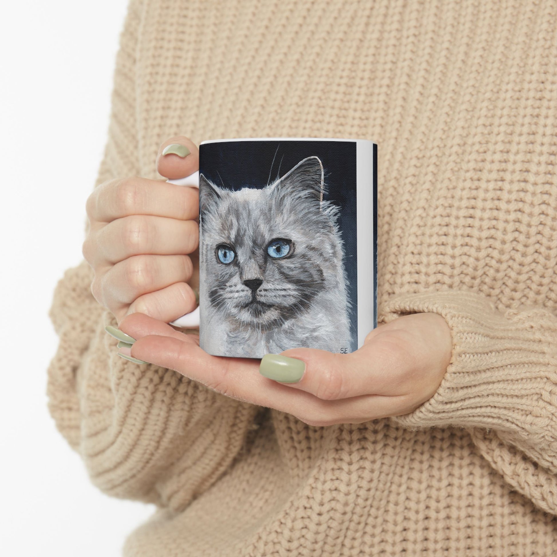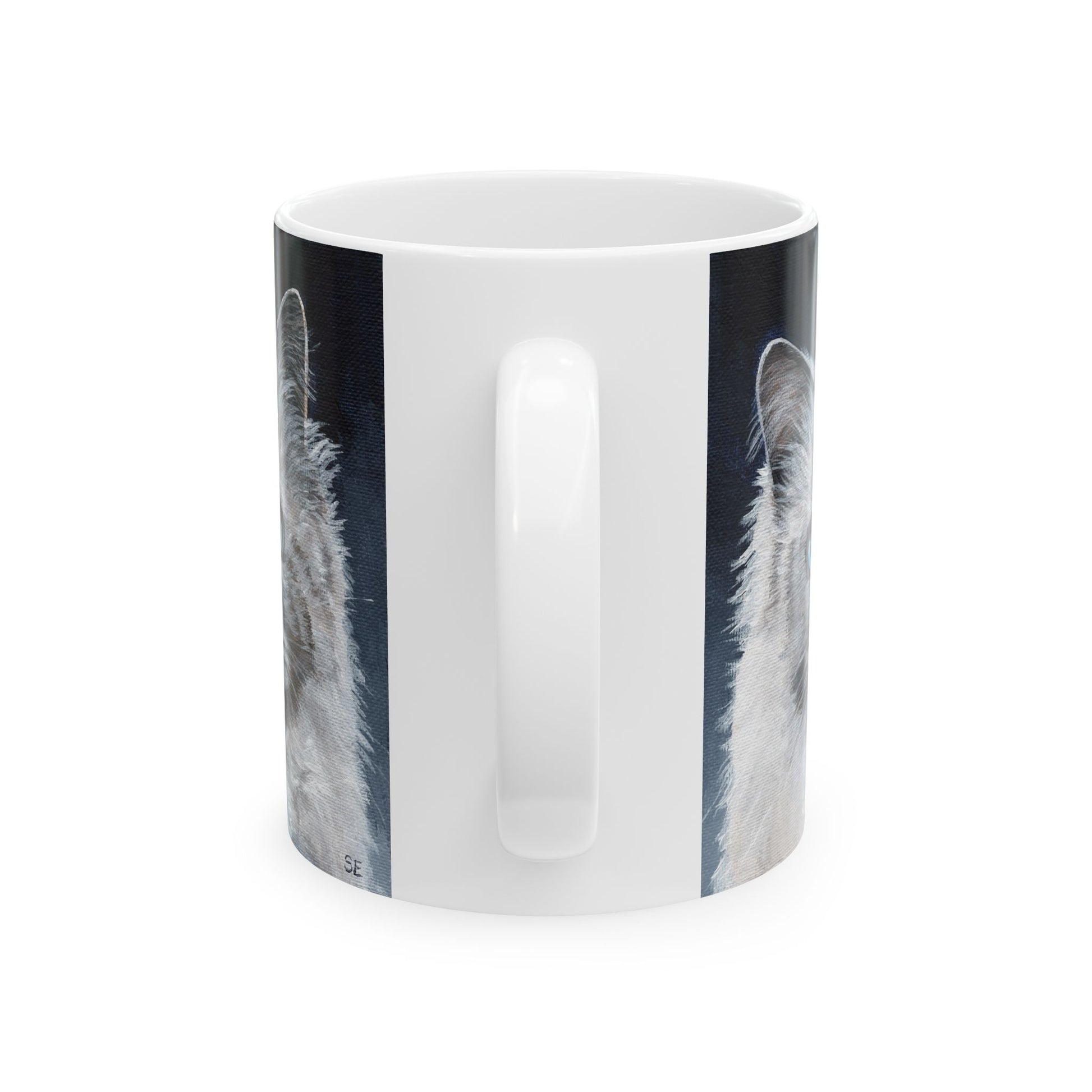 A glossy ceramic mug that brings soft, quiet charm to morning routines. Delicate painted fur and striking blue eyes peek from either side of the cup, creating a gentle, almost companionable presence with every sip. The shiny finish makes the artwork pop, while the comfortable C-handle and two size options let this mug move from early coffee to late-night tea with ease. Durable, lead- and BPA-free construction and crisp, vibrant printing mean the image stays lively through daily use and washings. This piece suits people who savor slow moments at home, desk-side daydreaming, or cozy evenings curled up with a warm drink.