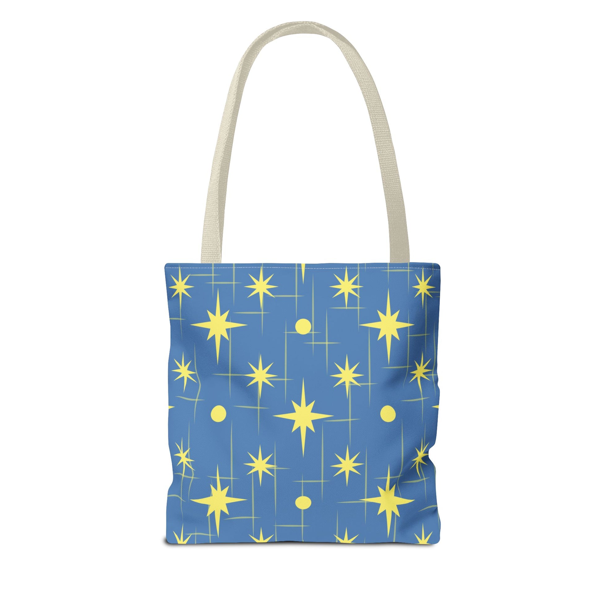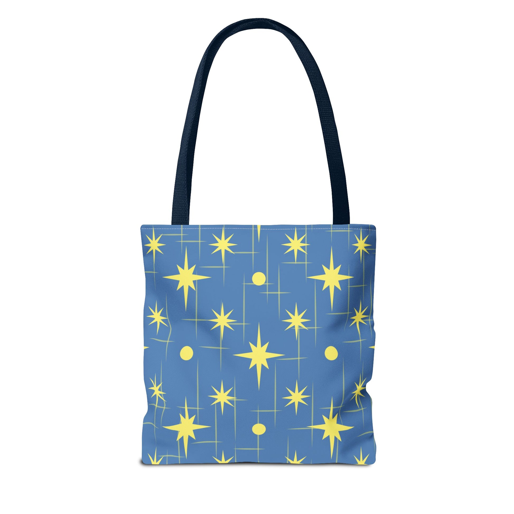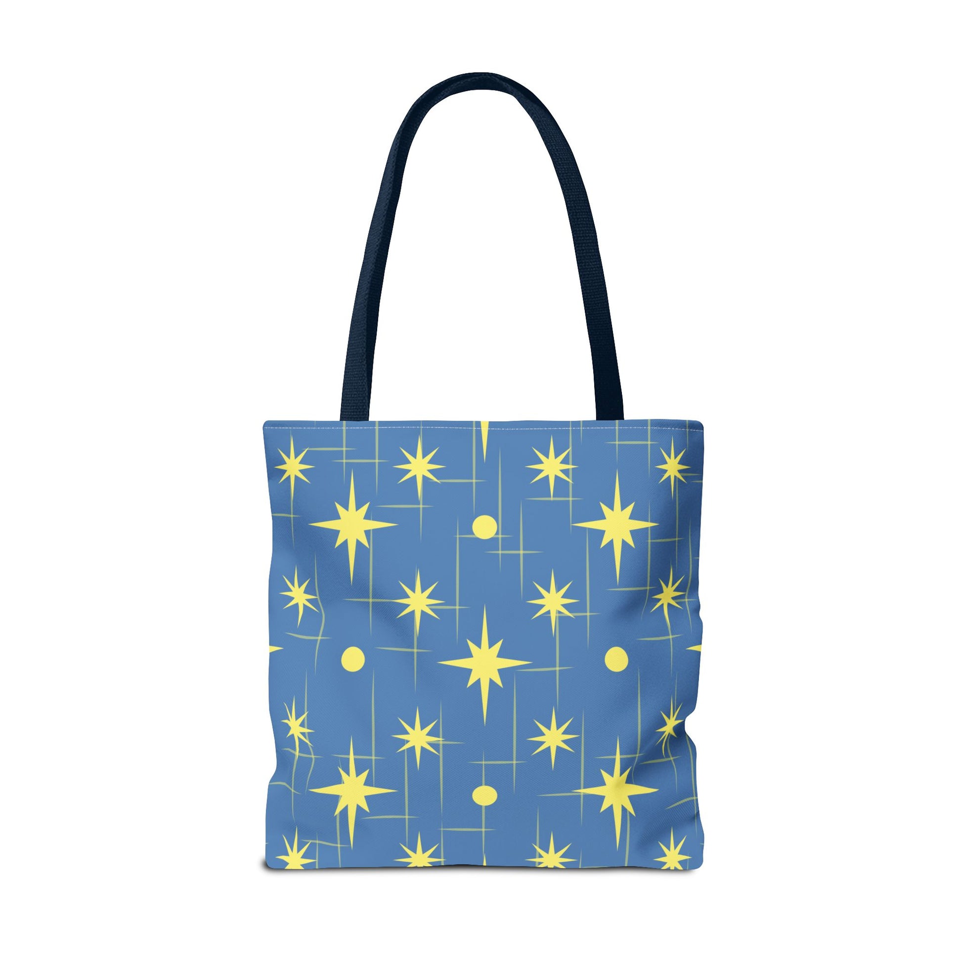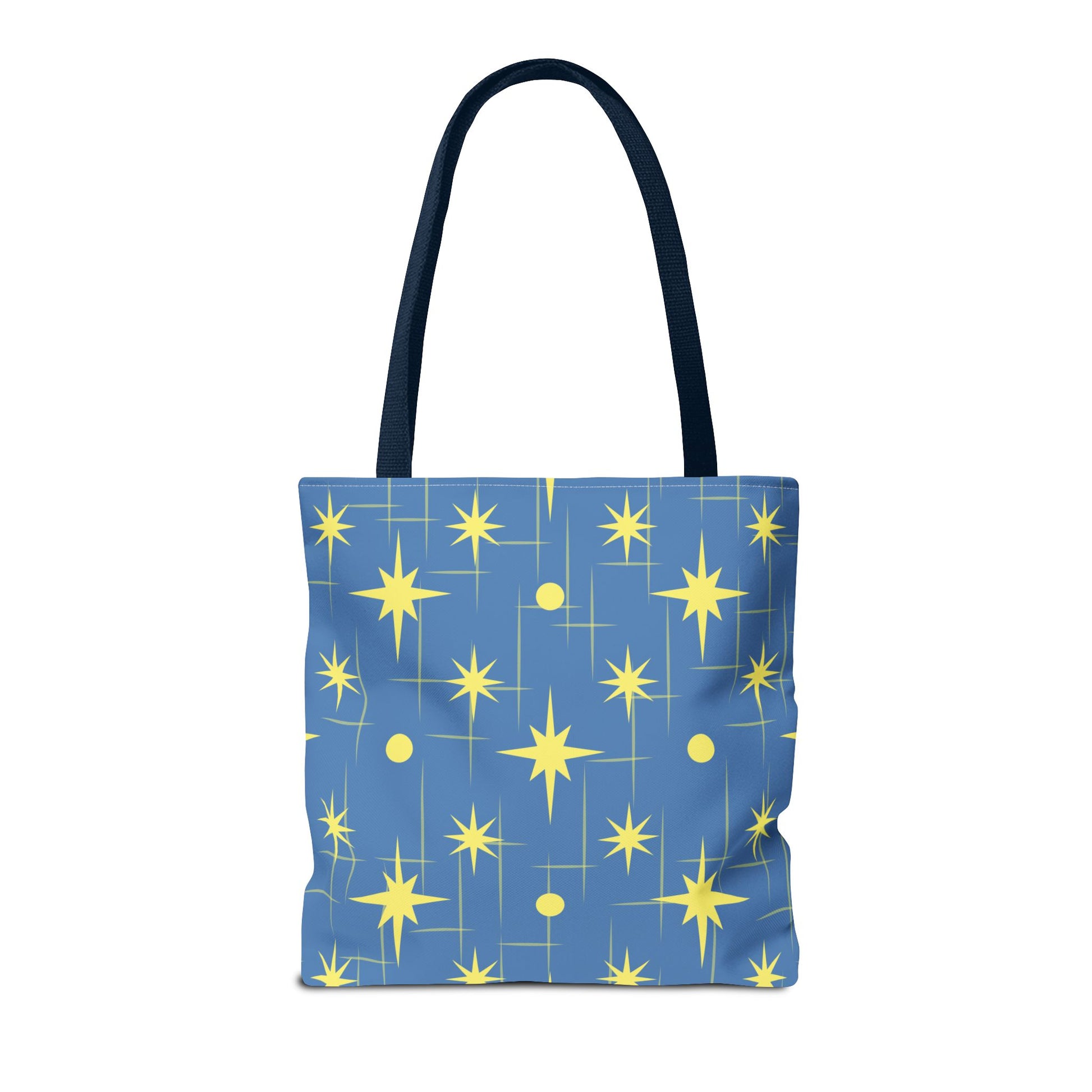 This star-patterned tote brings a gentle, uplifting energy to everyday carry. Soft-blue canvas is scattered with warm, golden stars and subtle linear accents — a quiet nod to night skies and small ambitions. Lightweight yet sturdy, the bag holds library books, market finds, or a laptop sleeve without losing shape. The black cotton handles sit comfortably on the shoulder; boxed corners add volume so things don’t spill out. Keep it for morning errands, late-night study sessions, or as a little reminder to aim higher on ordinary days.