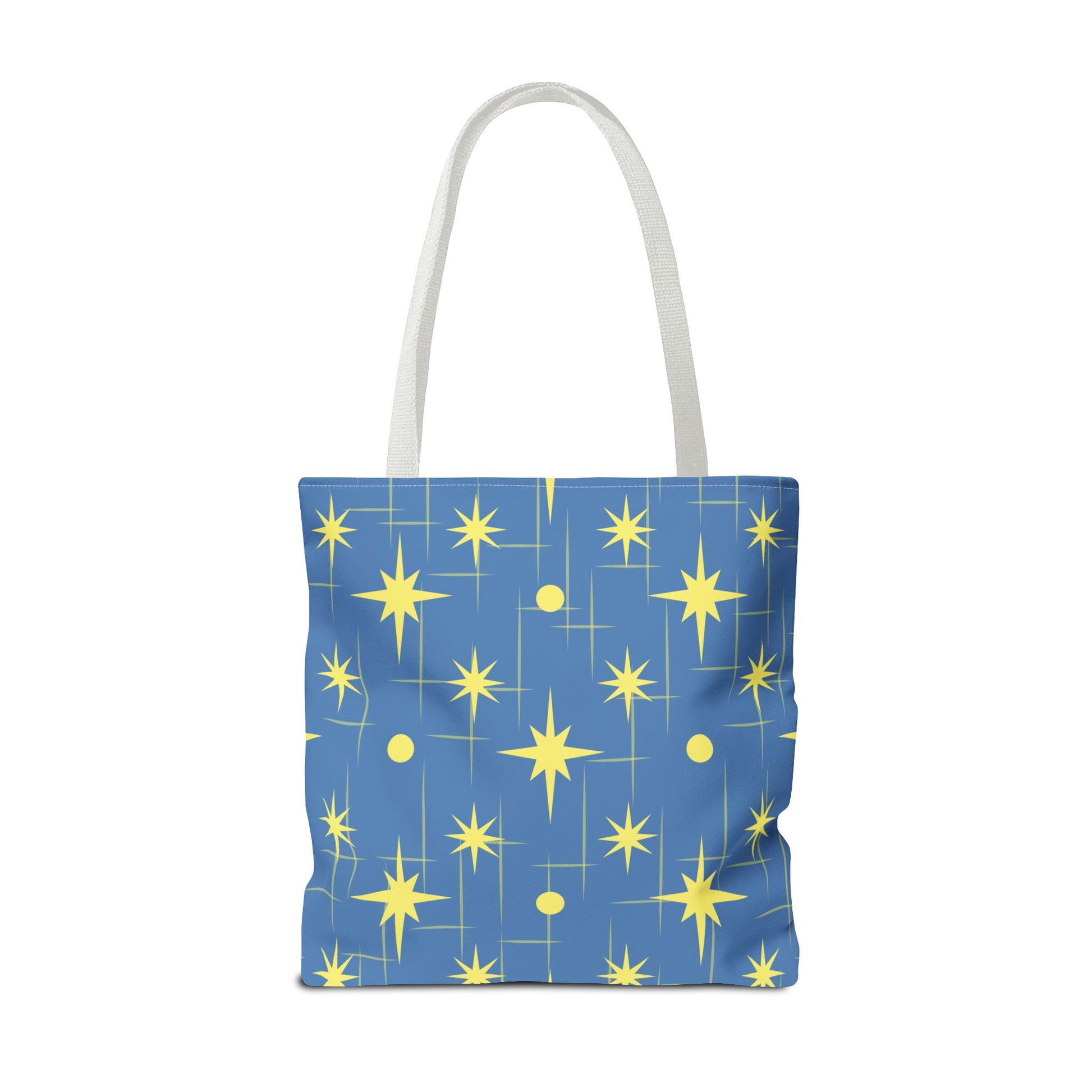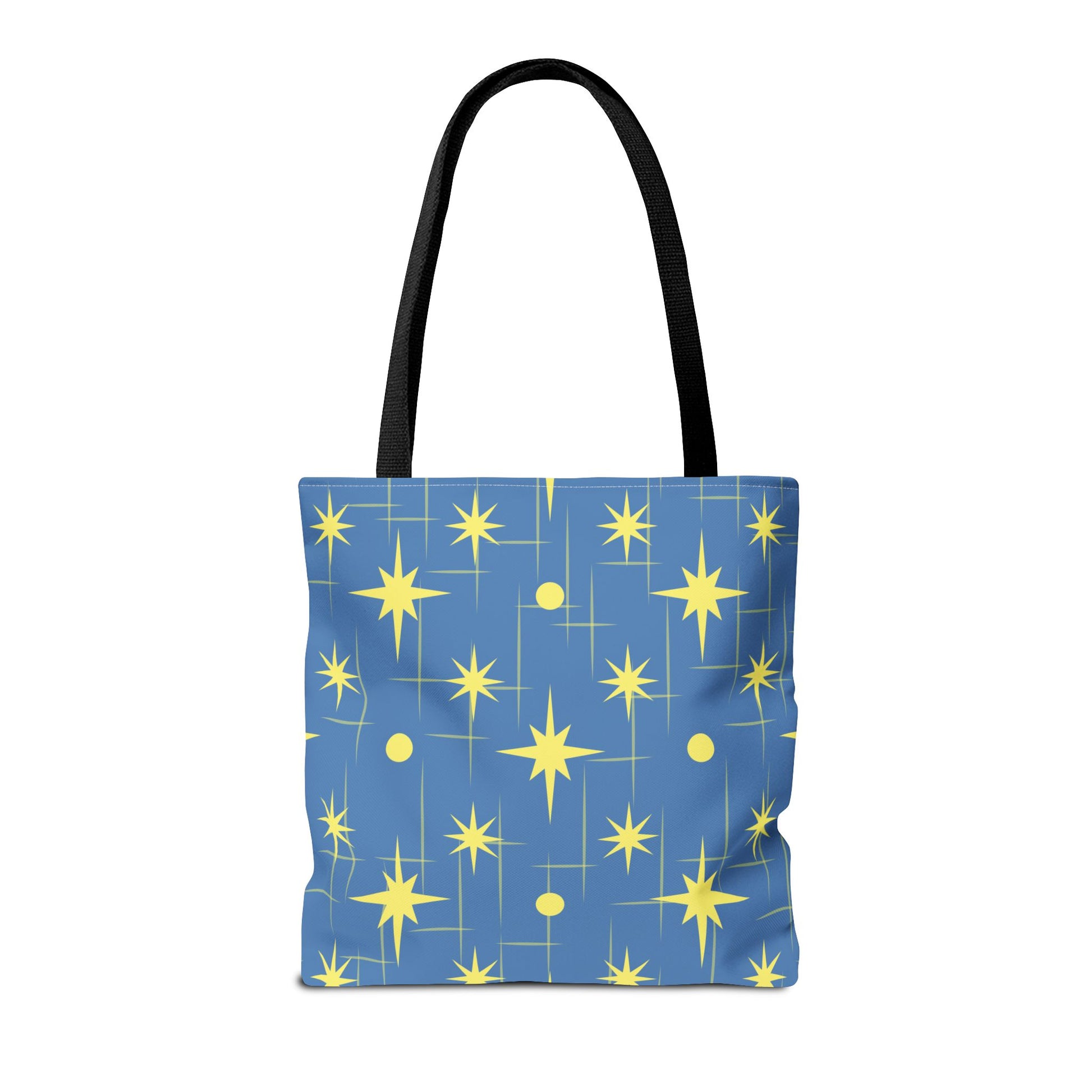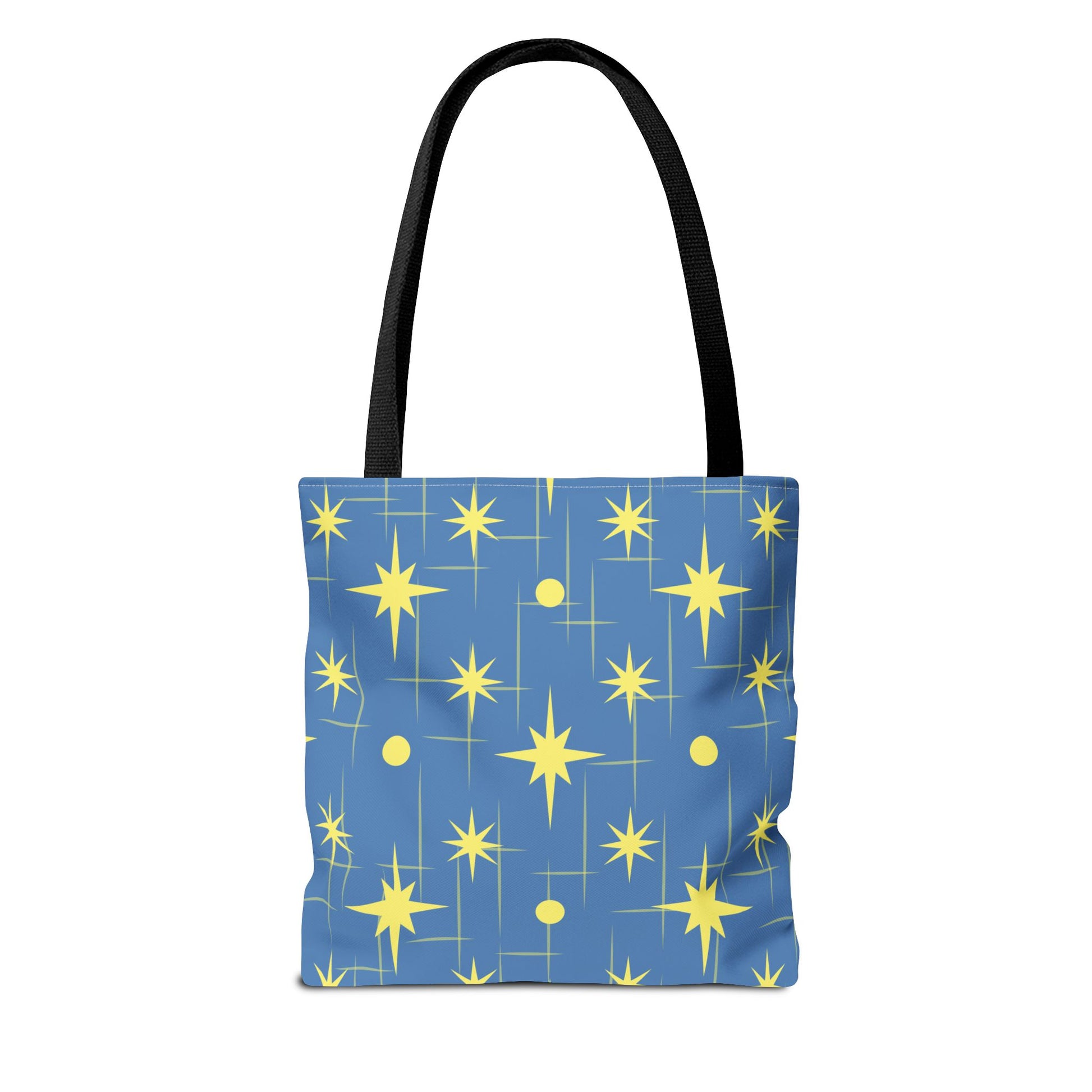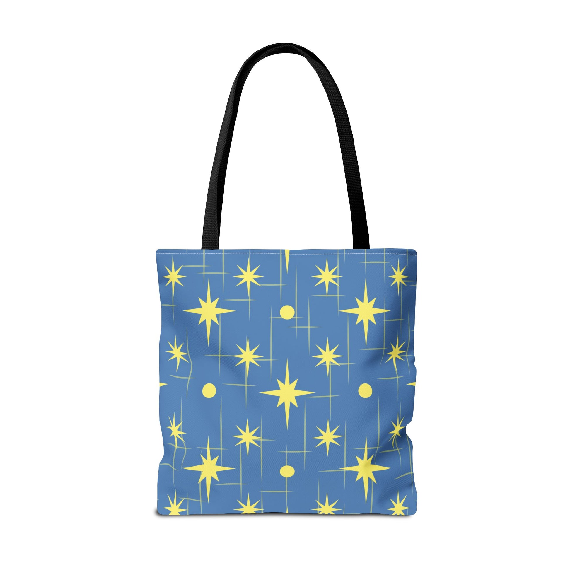 This star-patterned tote brings a gentle, uplifting energy to everyday carry. Soft-blue canvas is scattered with warm, golden stars and subtle linear accents — a quiet nod to night skies and small ambitions. Lightweight yet sturdy, the bag holds library books, market finds, or a laptop sleeve without losing shape. The black cotton handles sit comfortably on the shoulder; boxed corners add volume so things don’t spill out. Keep it for morning errands, late-night study sessions, or as a little reminder to aim higher on ordinary days.