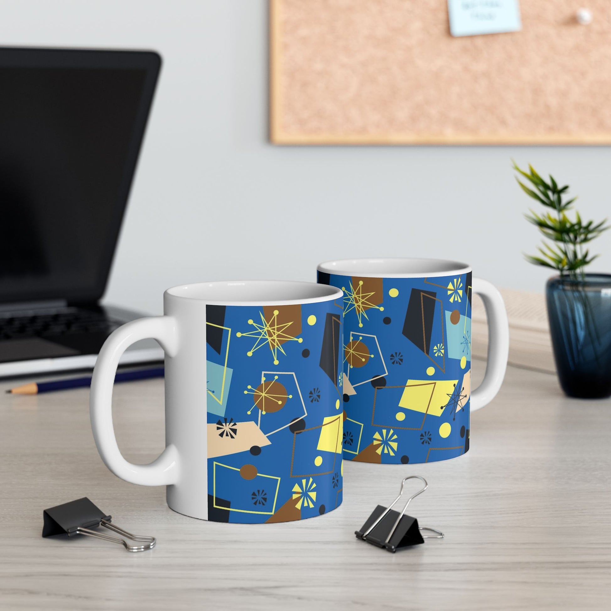 Bright, glossy ceramic mug with a mid-century modern pattern in deep blues, mustard yellow, black and soft beige. The abstract geometric and starburst motifs wrap around the surface, turning an everyday coffee or tea ritual into a small, joyful moment. The smooth C-handle and shiny finish make this mug comfortable to hold and easy to display on a shelf when not in use. Dishwasher- and microwave-safe, lead- and BPA-free — it’s built to be used every morning, afternoon, or whenever you need a colorful pick-me-up.