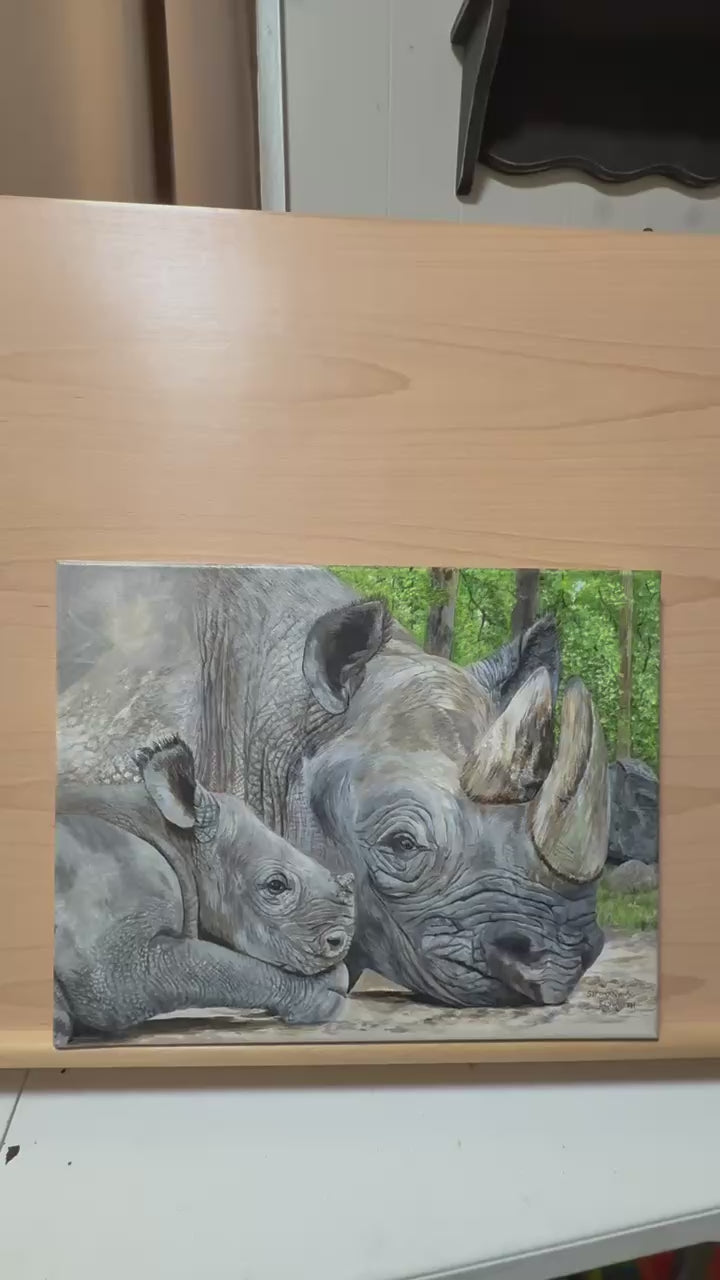 Capture the majesty of wildlife with this original acrylic painting of a rhinoceros family. Measuring 14 x 11 inches and painted on all sides, it offers a striking presence that stands beautifully on its own without framing. Perfect for nature lovers and those passionate about endangered animals, this artwork brings a vivid connection to the wild into your space. Note that the watermark appears only in the preview and is not on the actual piece. Free shipping in the continental United States only.