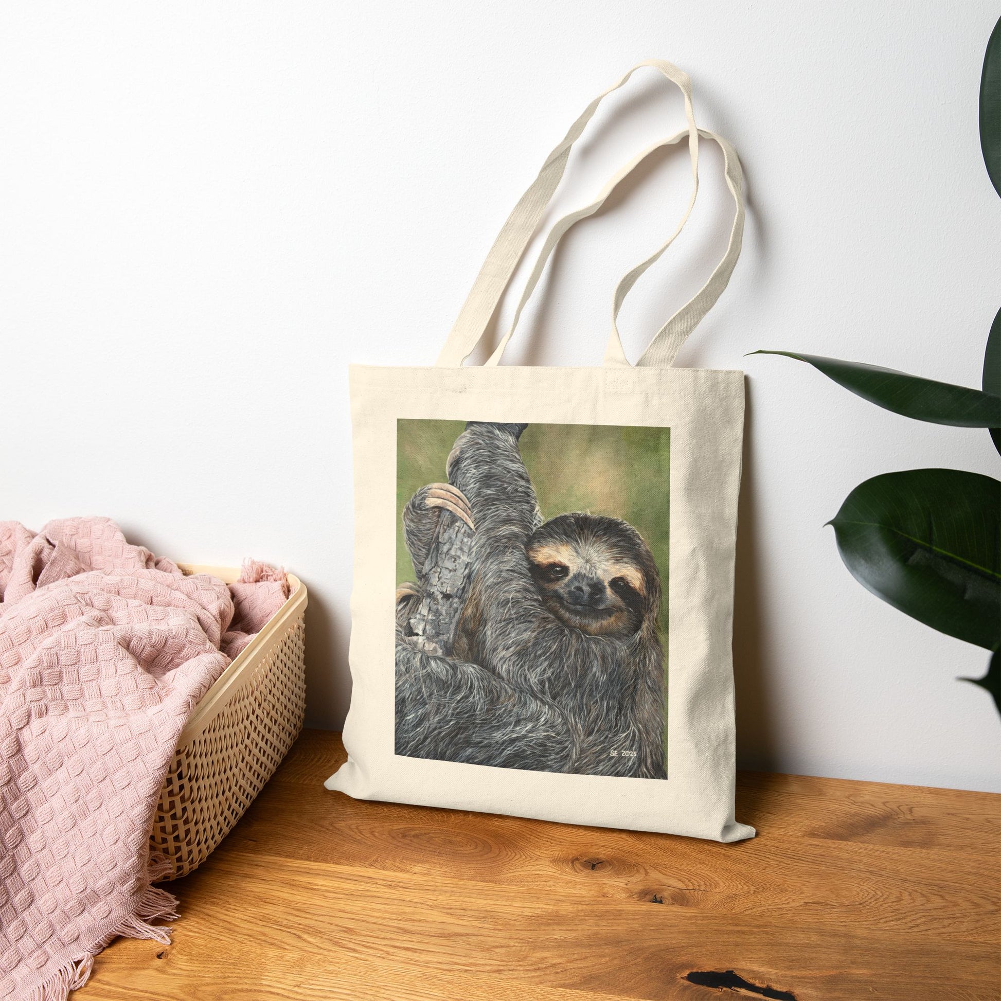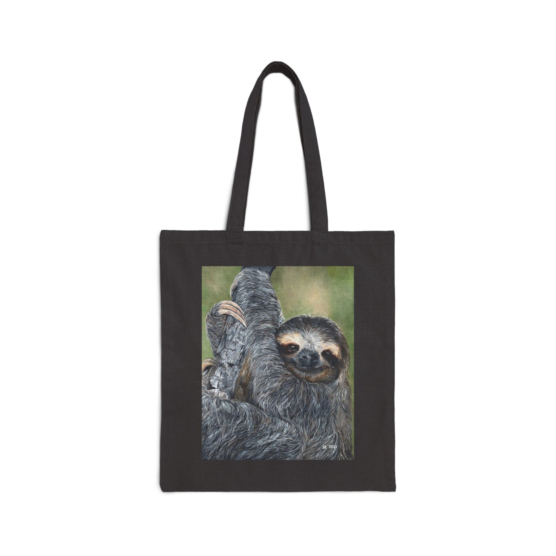 Soft sunlight filters through leaves as a slow-smiling sloth hangs from a branch — this cotton canvas tote brings that easy, unhurried energy with you. The printed portrait sits centered on a natural or black heavy canvas, made to carry groceries, books, or whatever slows you down in the best way. Sturdy handles and reinforced stitching keep the load steady while the sewn-in label and solid flat-corner construction give it a clean, crafted feel. This tote folds into daily life for people who move at their own pace and appreciate gentle, nature-inspired art on dependable material.