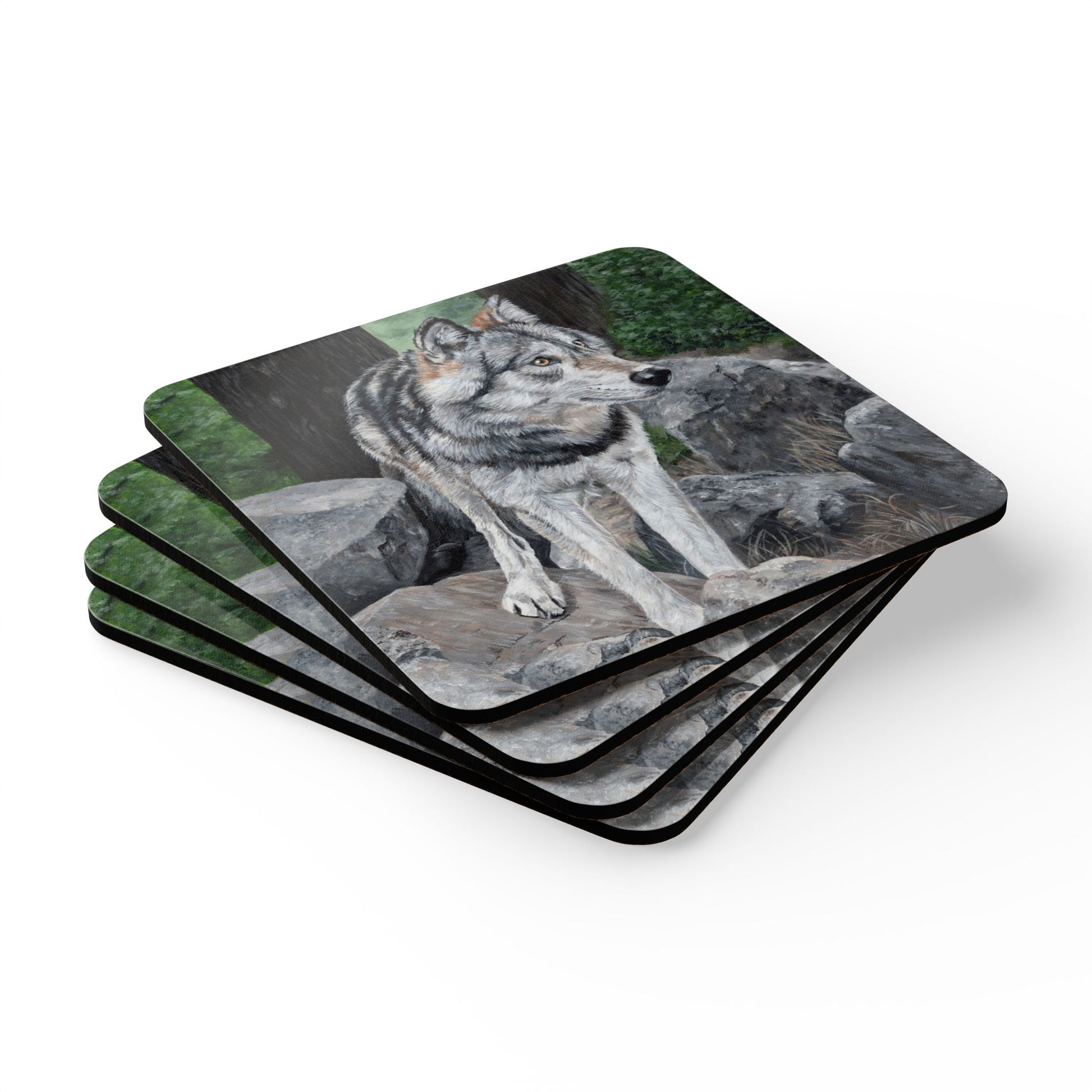 Carry the quiet intensity of the forest to your table with this four-piece cork-backed coaster set. Each coaster shows a lifelike wolf poised among rocks and pines — a slice of wilderness that keeps a cup steady and your surfaces safe. The high-gloss top makes the detailed artwork pop, while the cork underside grips and protects. These coasters feel right at home in cabins, reading nooks, and anywhere you want a small, steady reminder of wild places.