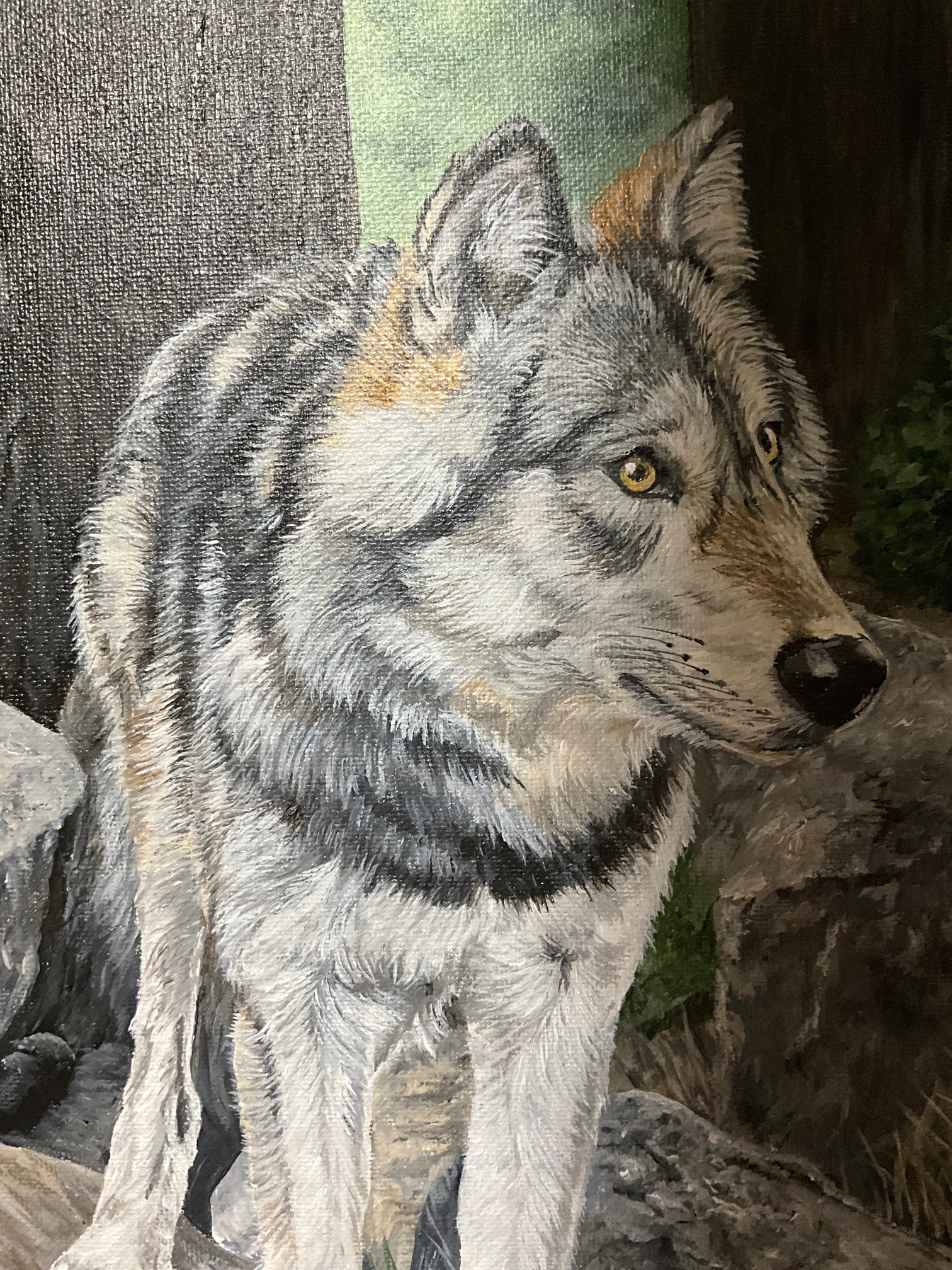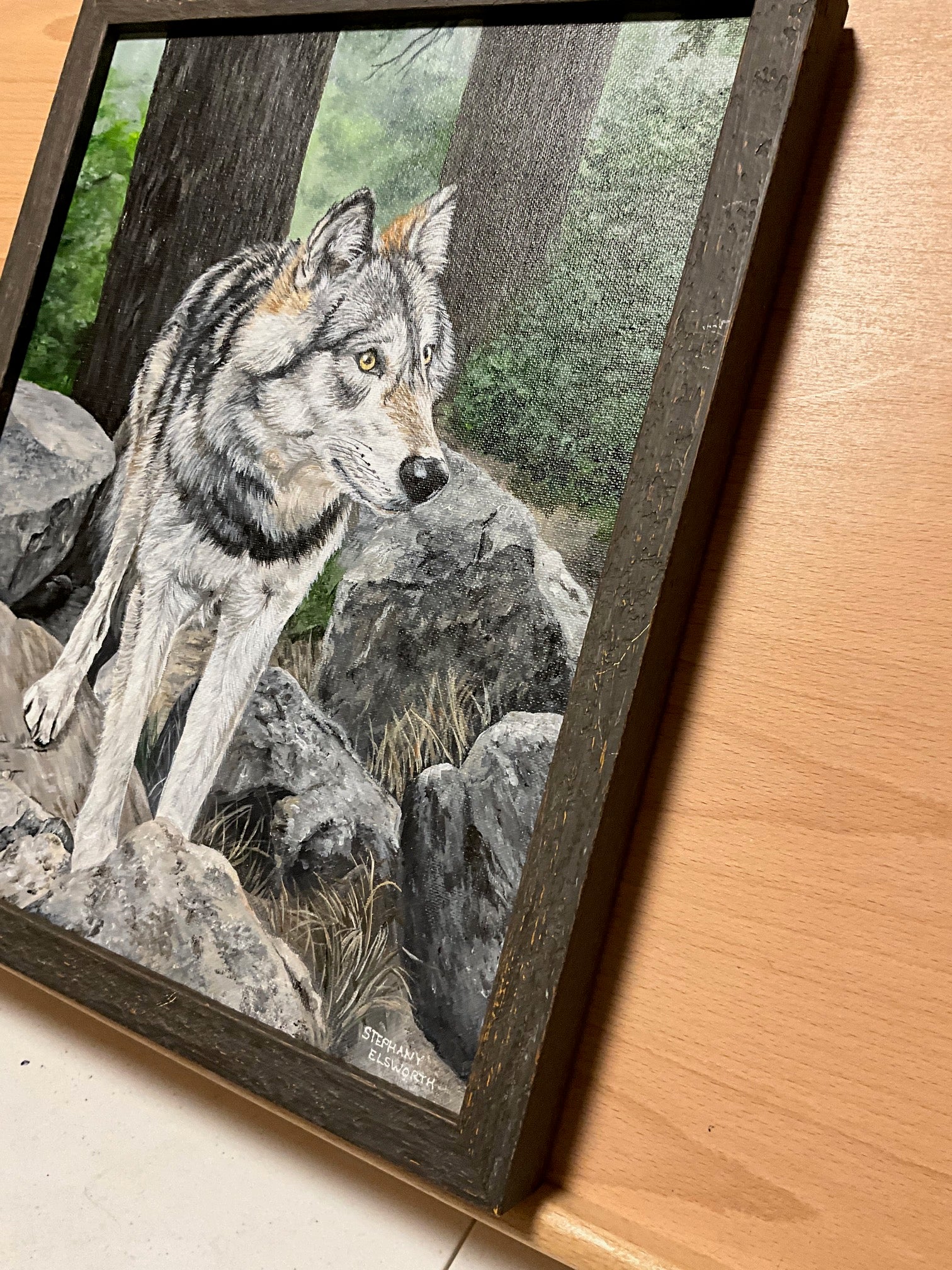 Wolf on Rocks 11 x 14 inch Original Custom Framed Acrylic Painting