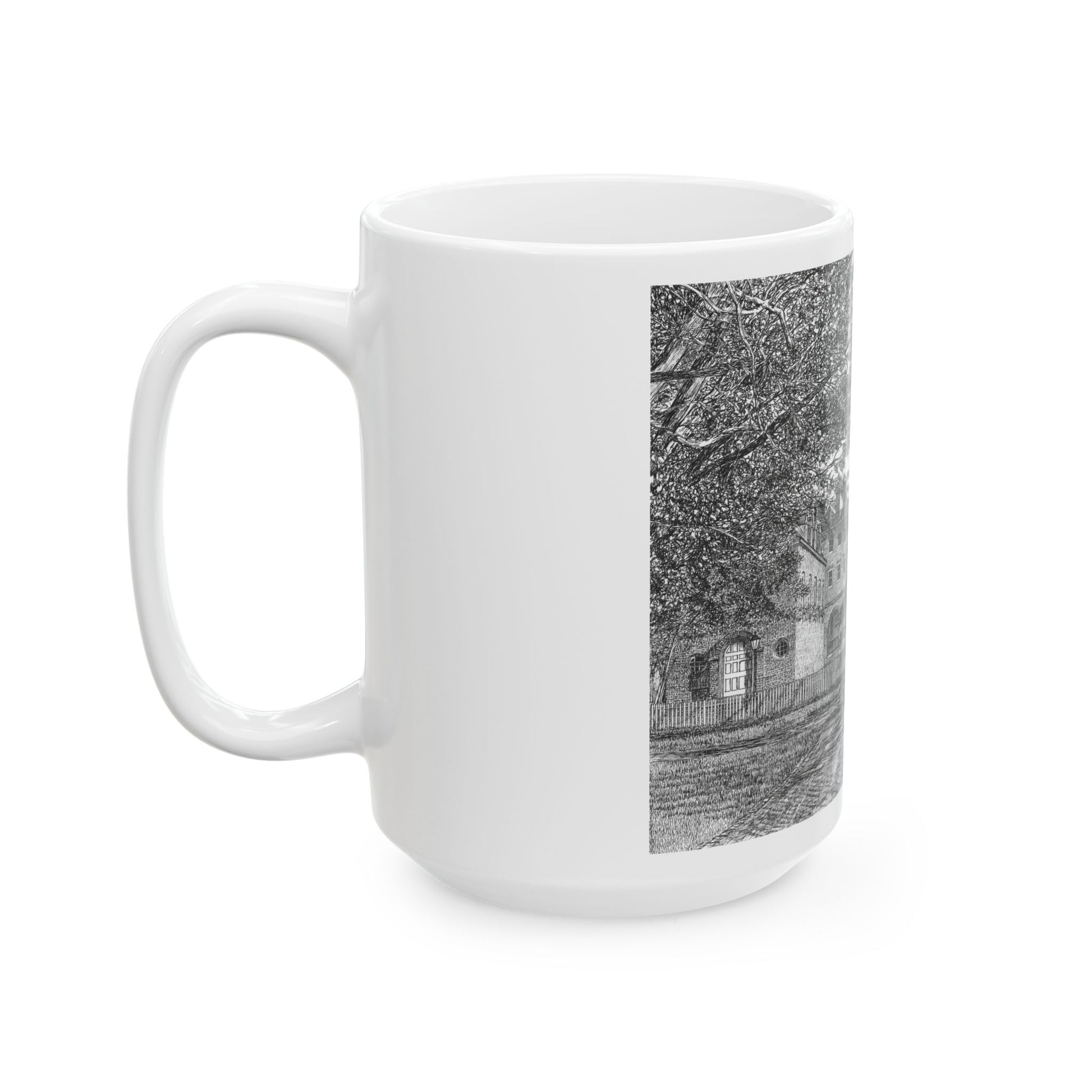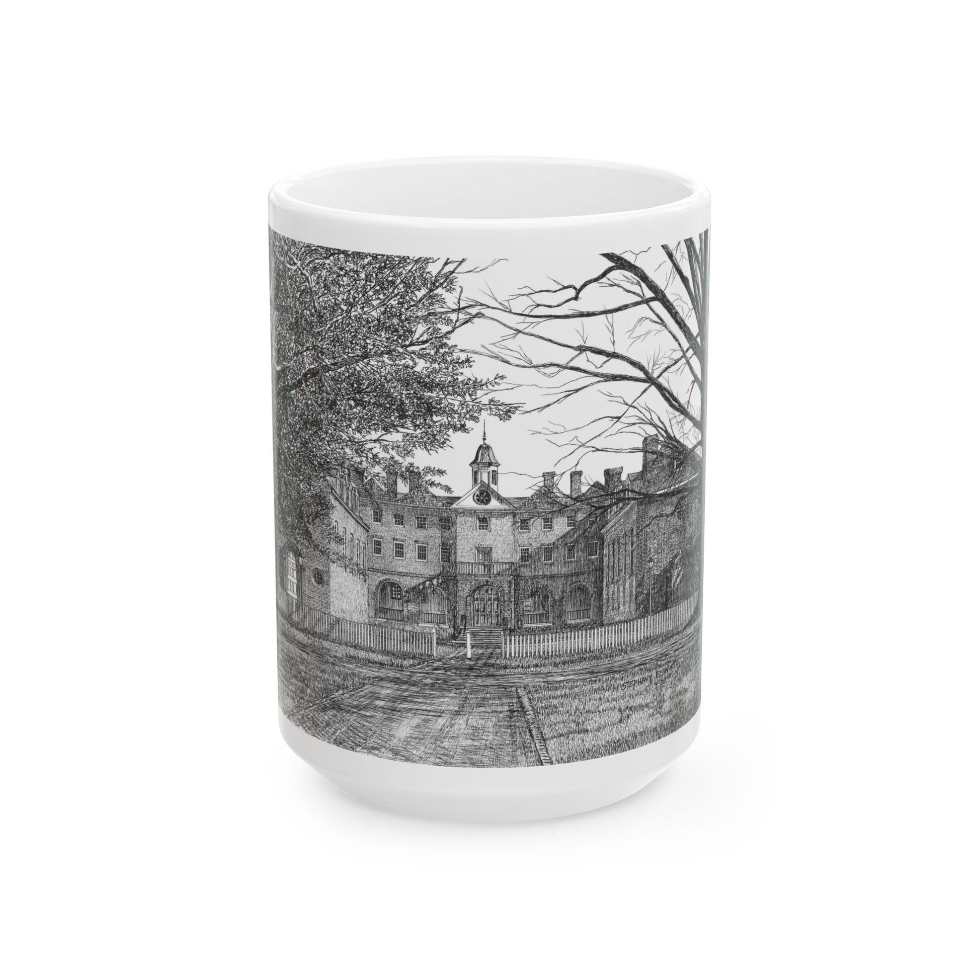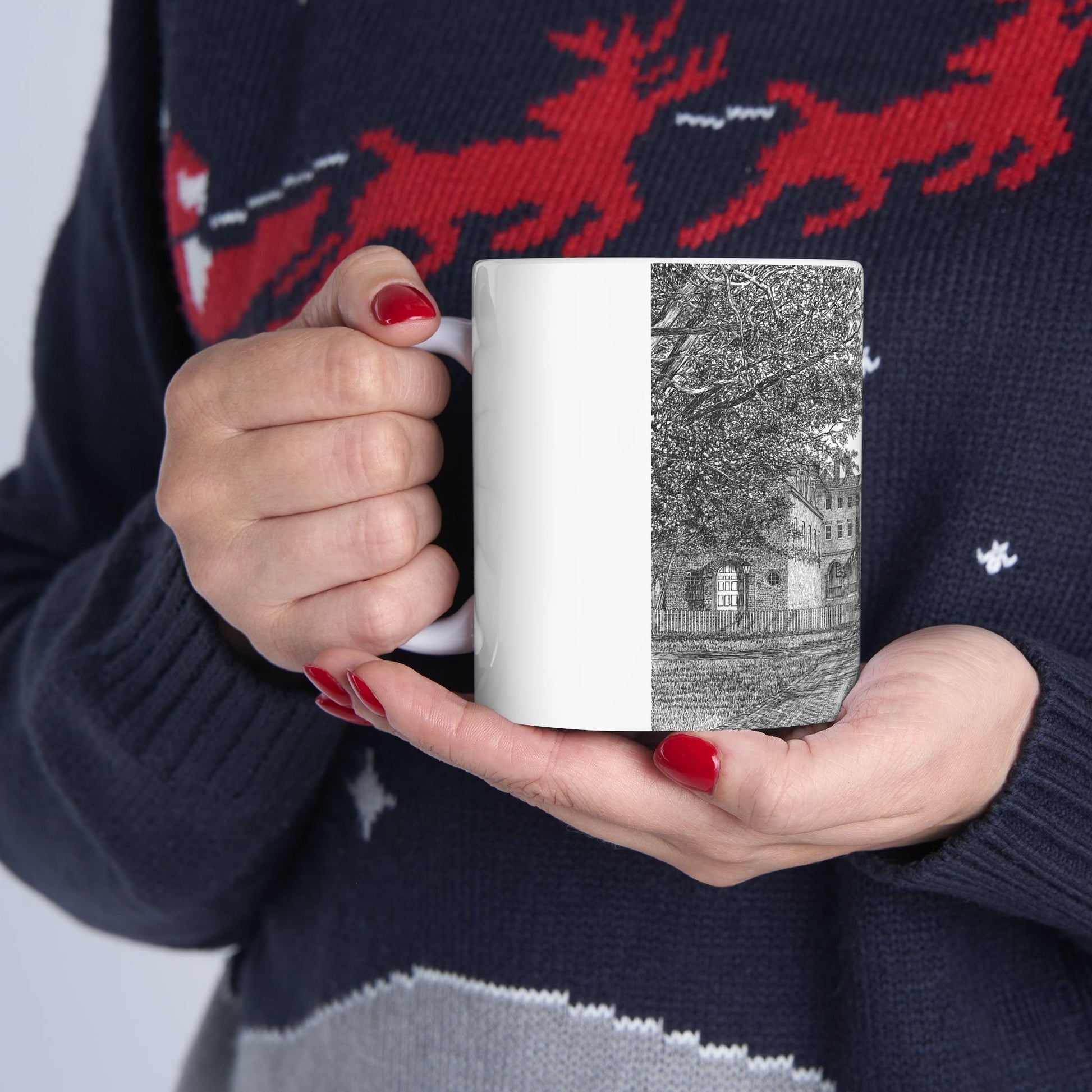 This glossy ceramic mug carries a finely detailed monochrome sketch of the College of William and Mary's historic Wren Building, inviting slow sips and quiet moments. The black-and-white illustration wraps around the cup, offering different vignettes from every angle—arched doorways, a clock tower, bare winter trees—so each coffee break feels like stepping into an old town memory. Lightweight yet sturdy, the comfortable C-handle and smooth rim make it easy to hold during a morning read or a late-night sketching session. Dishwasher- and microwave-safe, lead- and BPA-free, it’s built for everyday use while showcasing an artful, nostalgic vibe that resonates with lovers of architecture, urban sketches, and contemplative ritual.